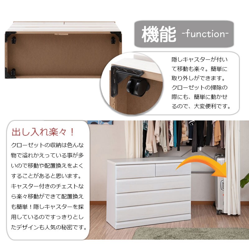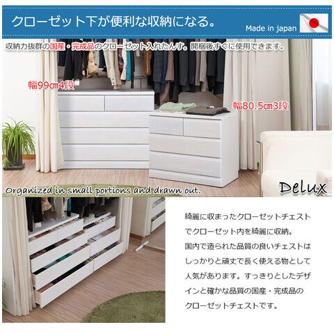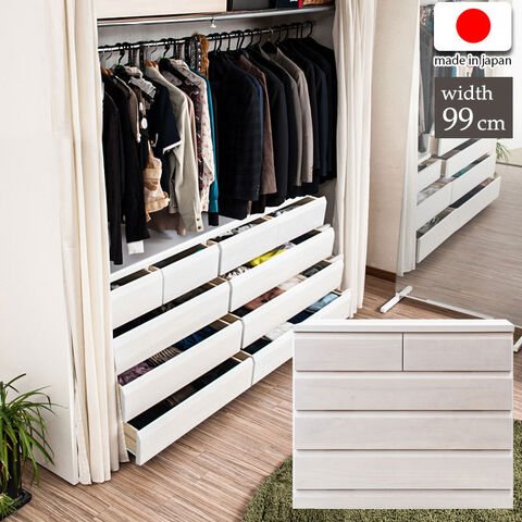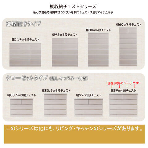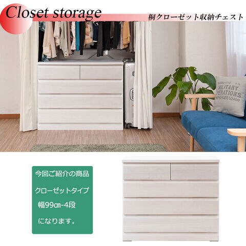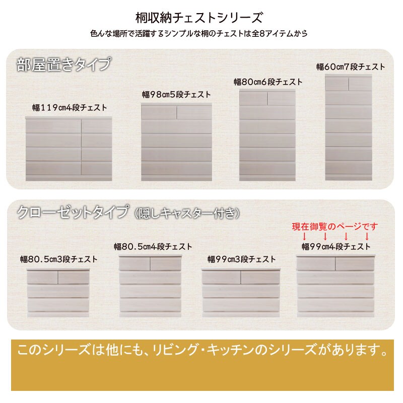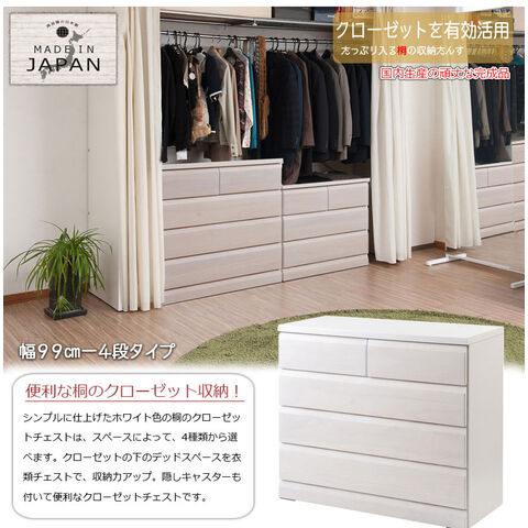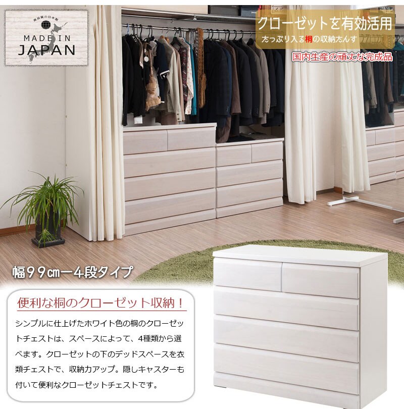 日本製 クローゼットチェスト 幅99 4段 ホワイト チェスト 四段 クローゼット 収納 幅99cm 99cm幅 完成品 キャスター付き 北欧 木製 シンプル 天然木 桐 衣類収納 白 国産【送料無料】