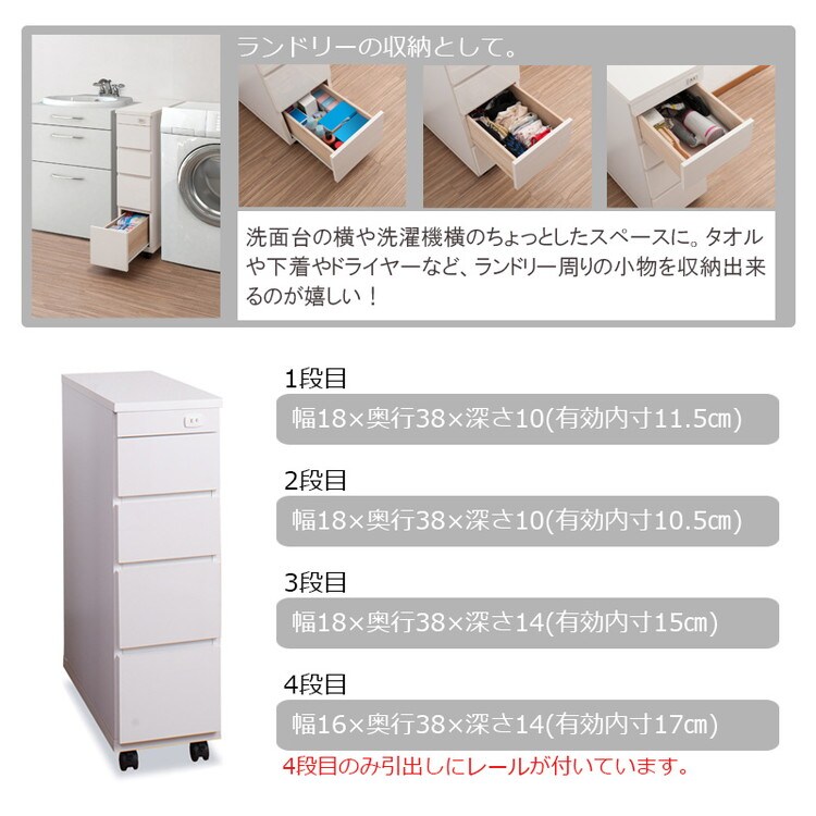 引出し内寸:(上から)(約)幅18×奥行38×深さ10(有効11.5)cm、(約)幅18×奥行38×深さ10(有効10.5)cm、(約)幅18×奥行38×深さ14(有効15)cm、(約)幅16×奥行38×深さ14(有効17)cm