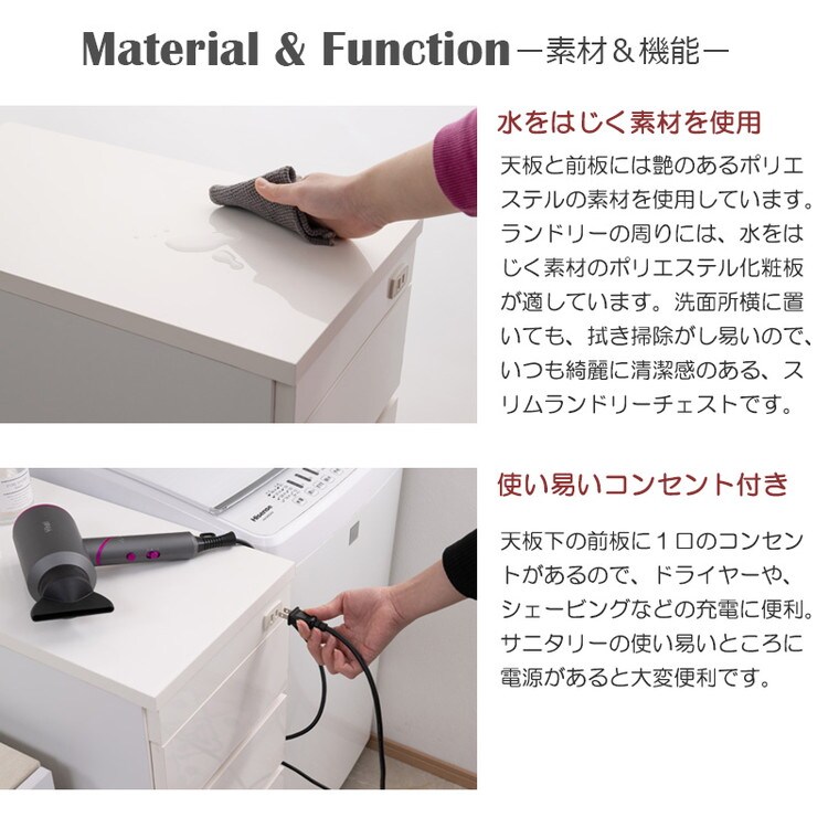 ランドリーの周りには、水をはじく素材のポリエステル化粧板が適しています。洗面所横に置いても、拭き掃除がし易く、いつも綺麗に清潔感のある、スリムランドリーチェストです。