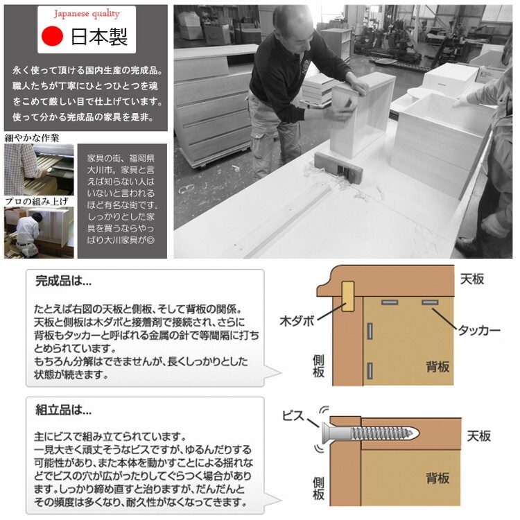 日本製・完成品の高品質のシンプルな仕上げで人気の商品です。スペースに合わせて、3サイズからチョイスできます。背面は化粧仕上げになっているので、どこに置いても美観を損ないません。