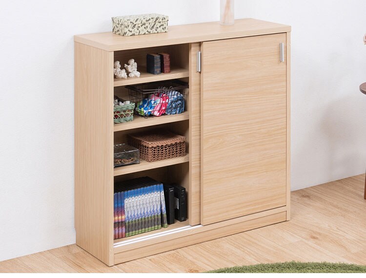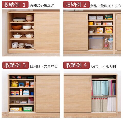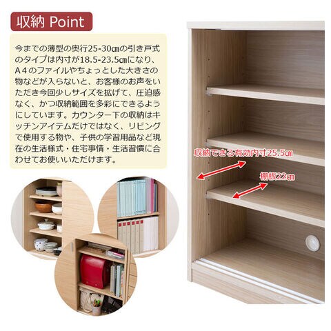 アイテムも豊富でカウンター下のデッドスペースを有効活用でき造り付けのような仕上がりです。開き扉の商品では、開閉のためにスペースが扉の幅分必要になってきますが、引き戸式ならわずかなスペースでOK。可動棚板の後部に1cmのすき間があり、上下の配線がしやすくなっています。配線に便利なコード穴付きで、ルーターなども収納できます。滑車付きの扉はスムーズな開閉でストレスなくご使用になれます。日本製&組立不要のすぐに使える完成品でお届け。
