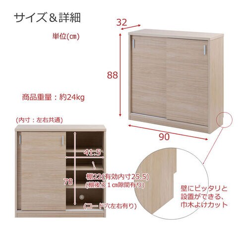 扉内寸/(約)幅41.5×奥行25.5(棚板22・棚後部1cm隙間あり)×高さ78cm(左右共通)
