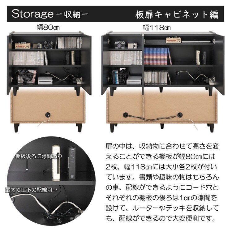扉の中は、収納物に合わせて高さを変えることができる棚板が幅80cmには2枚、幅118cmには大小各2枚付いています。