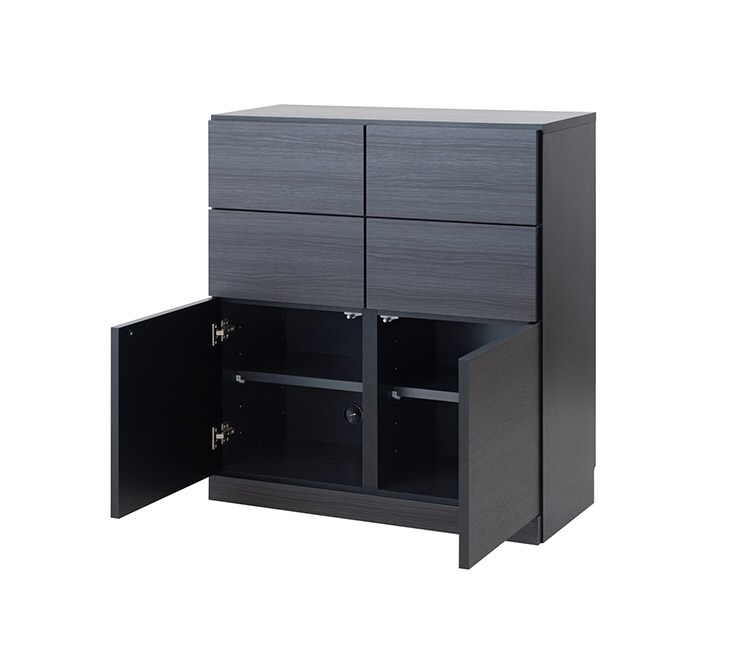 側板や内部に使用している木目のないスーパーブラックも傷がつきにくい強化紙を使用しています。本体のブラックと、天板と前板の木目の入ったブラックの絶妙な配色にこだわったデザイン。ブラックな木目が無機質なお部屋にプラス温かみを与えてくれます。6cmピッチで5段階移動ができる棚板は、キッチンやリビングで様々な使い方が可能。扉内はコード穴を設けて配線が必要な製品を使用される時に便利です。棚板を使用しても後ろに隙間を設けているので、扉内での配線もできるようになっています。扉と引出しには押して開けて、押して閉めるプッシュ式を採用。壁にぴったりと設置してもすき間ができないように背面に巾木よけカットを施しています。シンプルに仕上げて使い勝手もよく、便利な機能になっています。