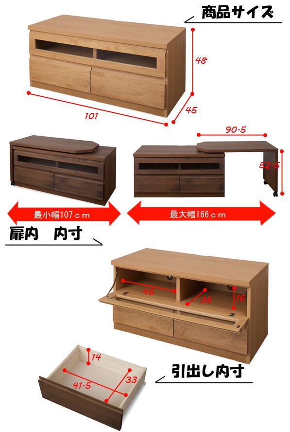 | 本体:(約)幅101×奥行45×高さ48cm 回転盤:(約)幅90.5×奥行45×高さ52.5cm ※設置時可動幅:(約)最小107~最大166cm フラップ部内寸:(約)幅45×奥行35×高さ16cm 引出し内寸:(約)幅41.5×奥行33×高さ14cm |