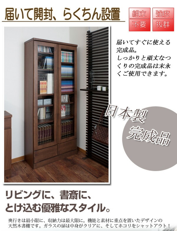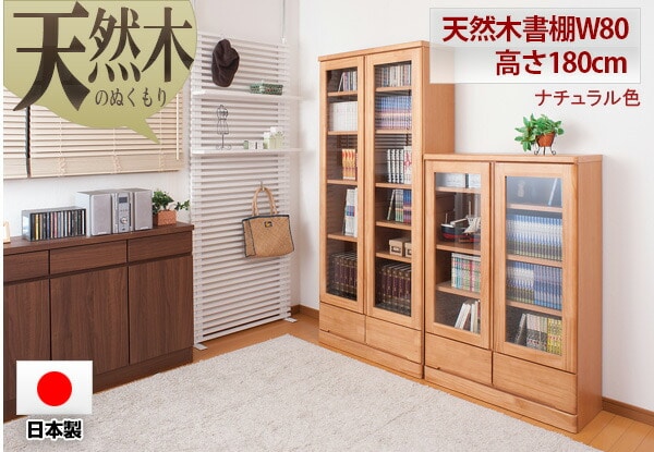 日本製 完成品 ガラス扉 本棚 天然木 書棚 幅80 ハイタイプ ナチュラル 書棚 ブックラック 木製 ラック 国産 収納 大容量 北欧 おしゃれ【送料無料】