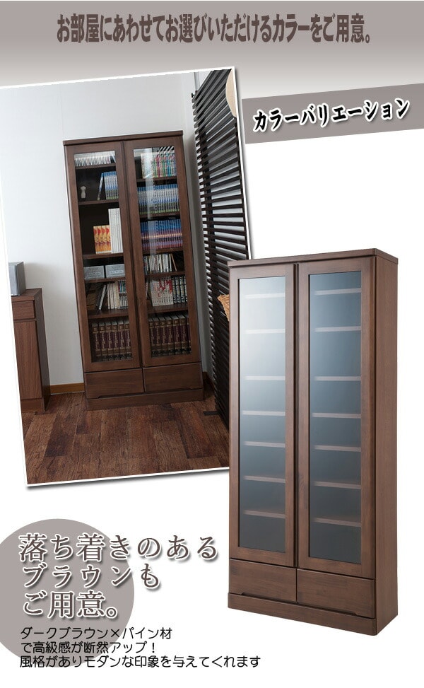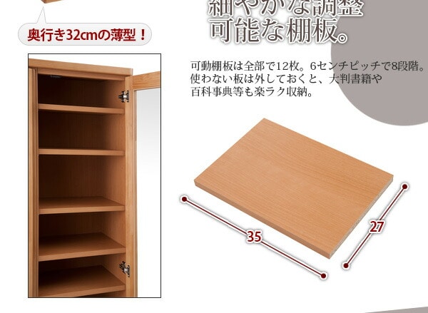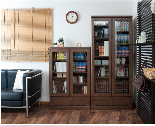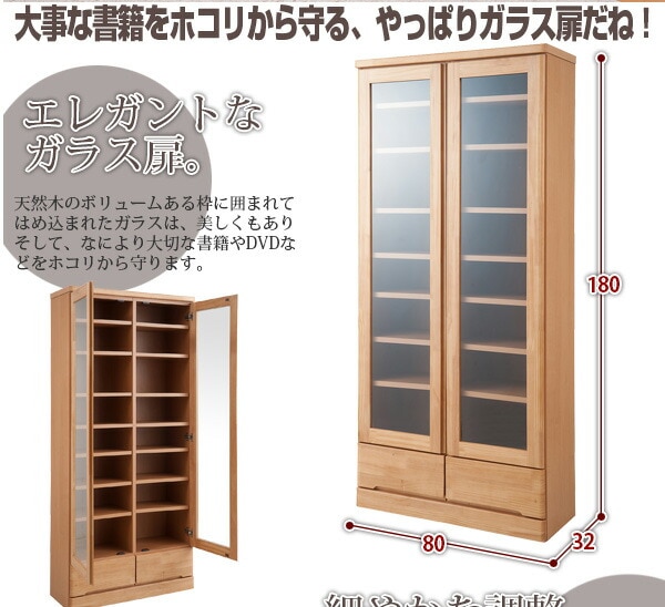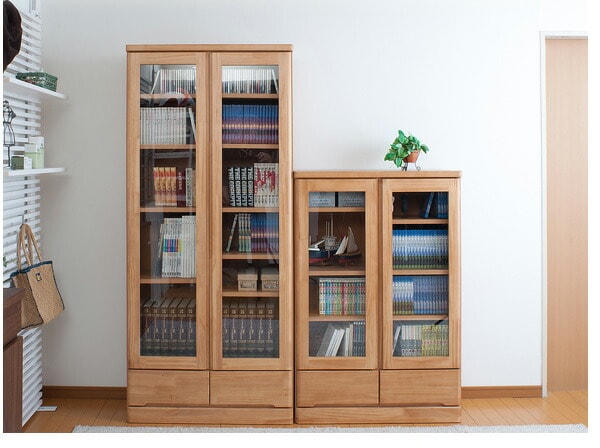 | 前板全面に天然木をあしらった贅沢な書棚。天然木の良さを細部にまで生かした高級仕上げ。ガラスに映りこむ日差し、ライトなどがより上品に雰囲気を醸し出します。書棚として、本だけでなくフリーボードとして収納&ディスプレイをお楽しみください。スッとお部屋に溶け込むナチュラル色、どっしり重厚感を感じられるブラウン色。前面の両サイドは角を落としたアール付きで人に優しいデザイン。こどもにも安心デザインで設置場所を選びません。奥行32cmの省スペース設計で書棚だけでなくキッチンで食器棚としても活躍します。 |