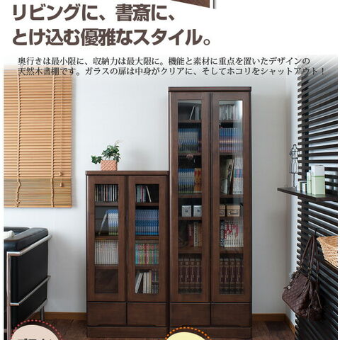 前板全面に天然木をあしらった贅沢な書棚。天然木の良さを細部にまで生かした高級仕上げ。ガラスに映りこむ日差し、ライトなどがより上品に雰囲気を醸し出します。書棚として、本だけでなくフリーボードとして収納&ディスプレイをお楽しみください。スッとお部屋に溶け込むナチュラル色、どっしり重厚感を感じられるブラウン色。前面の両サイドは角を落としたアール付きで人に優しいデザイン。こどもにも安心デザインで設置場所を選びません。奥行32cmの省スペース設計で書棚だけでなくキッチンで食器棚としても活躍します。