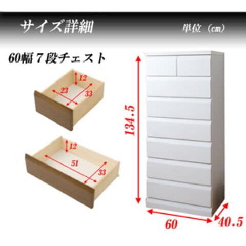 | 本体:(約)幅60×奥行40.5×高さ134.5cm 引出し内寸:小/(約)幅23×奥行き33×深さ12 大/(約)幅51×奥行き33×深さ12 |