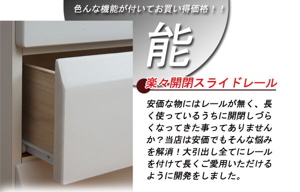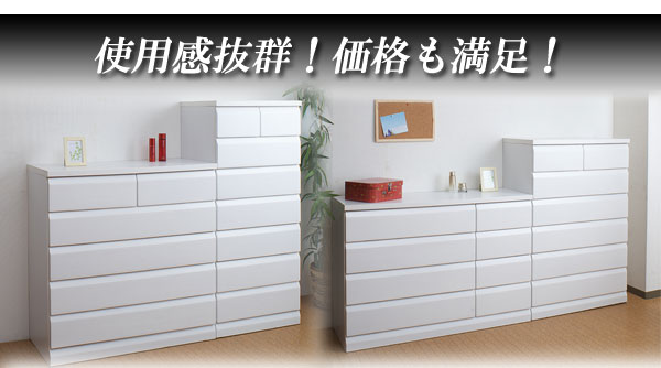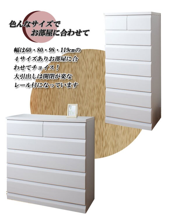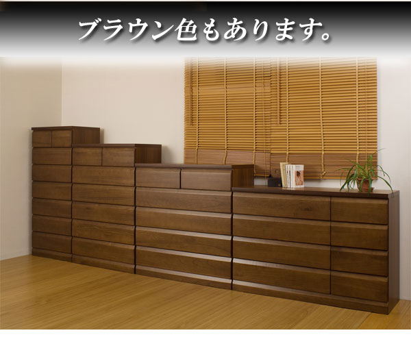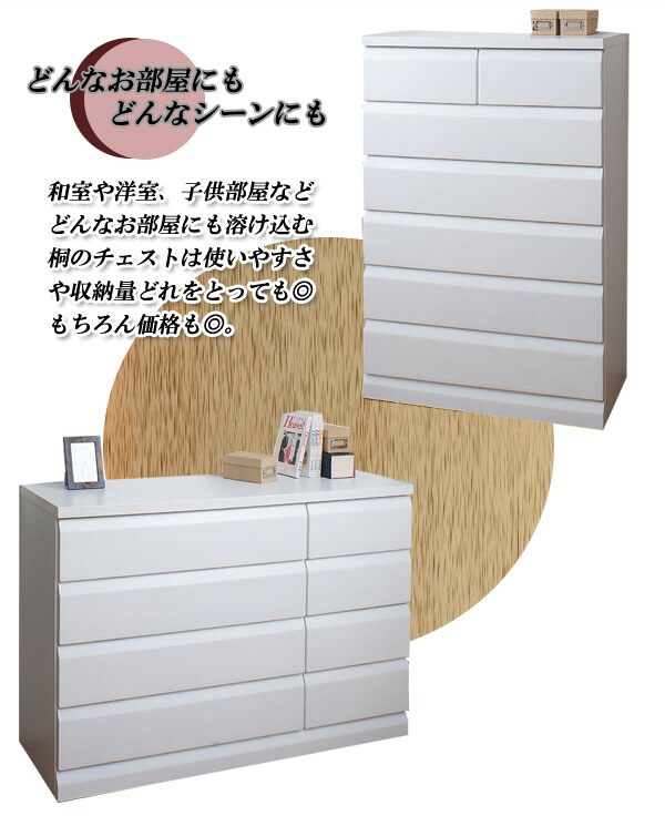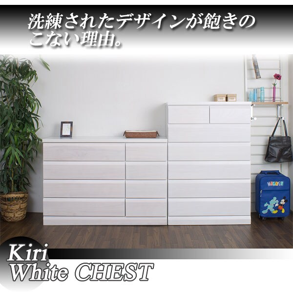 | 天然木桐材を使用した高級感のあるレール付のチェスト。サイズも4種類から選べるので、お部屋のスペースに合わせて。アンティックなホワイトとブラウンの2色から。ストレートに斜めカットを施した高級感のあるフェースは、お部屋に落着きと木肌の温かみを感じさせるグッドなデザイン。日本製の完成品のチェストは地板もきっちり入って長く使っても歪みや外れが少なく価値観のある、チェストです。 |