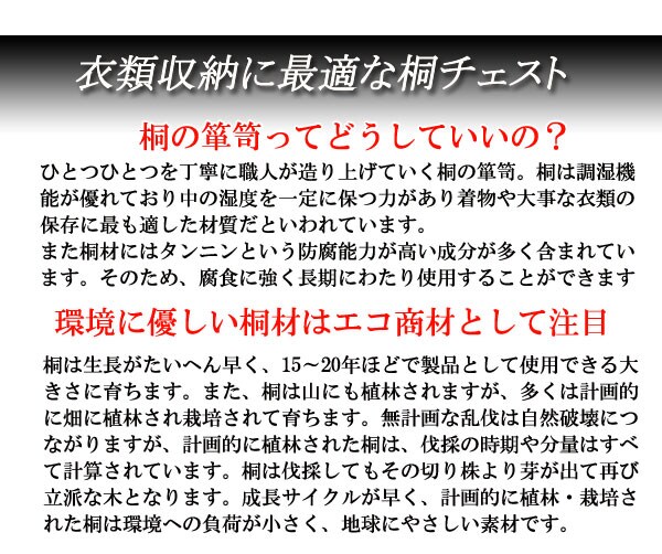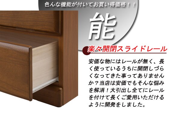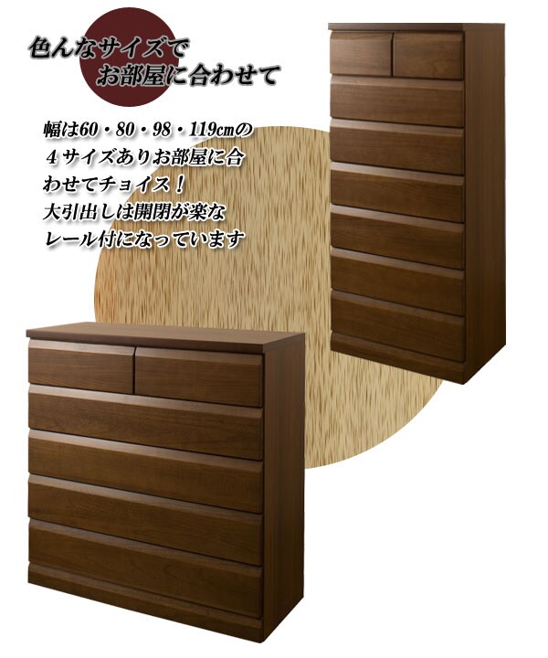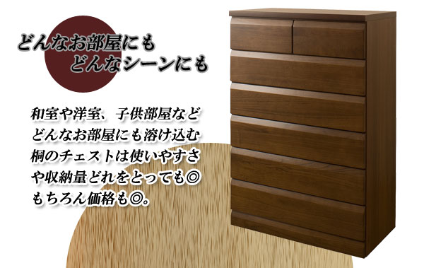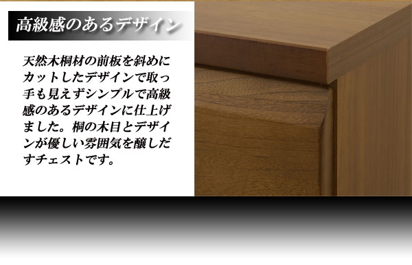 | 天然木桐材を使用した高級感のあるレール付のチェスト。サイズも4種類から選べるので、お部屋のスペースに合わせて。アンティックなホワイトとブラウンの2色から。ストレートに斜めカットを施した高級感のあるフェースは、お部屋に落着きと木肌の温かみを感じさせるグッドなデザイン。日本製の完成品のチェストは地板もきっちり入って長く使っても歪みや外れが少なく価値観のある、チェストです。 |