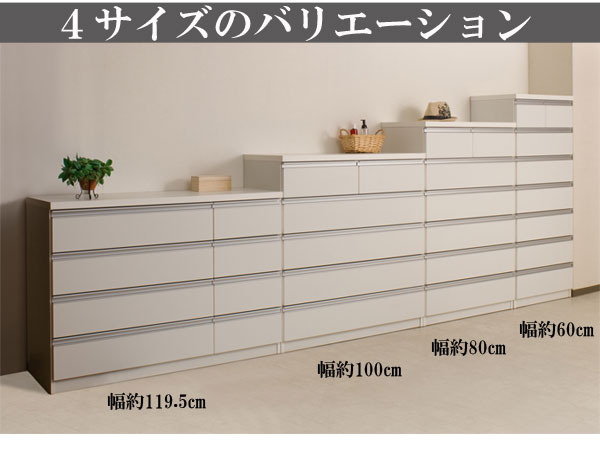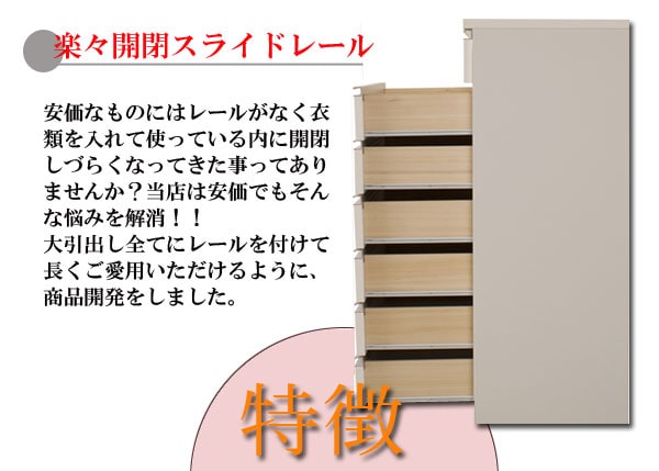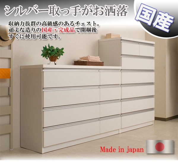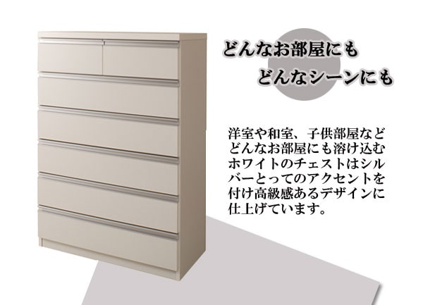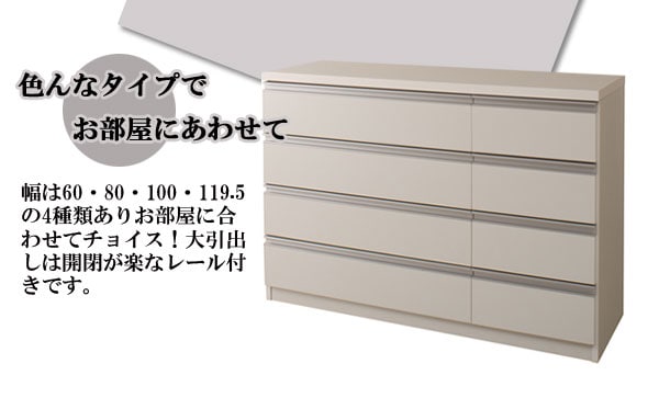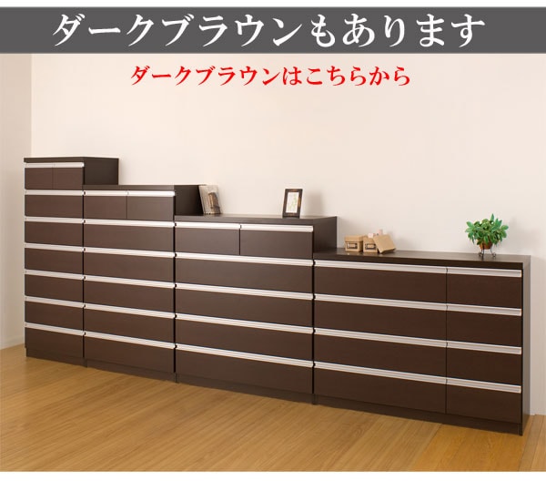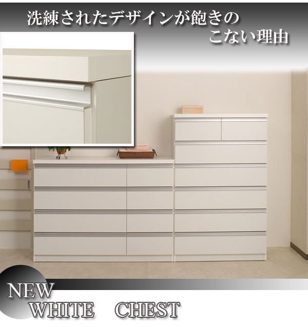 | シャープなデザインが際立つシンプル&高級チェストシルバーの取っ手がアクセントになり高級感を更に醸し出します。サイズは60幅・80幅・100幅・119.5幅の4サイズにホワイトとダークブラウンの2カラー。安心・安全の国産の完成品でクオリティーの高いチェストです。安価なものにはレールがなく衣類を入れて使っている内に開閉しづらくなってきた事ってありませんか?当店は安価でもそんな悩みを解消!!大引出し全てにレールを付けて長くご愛用いただけるように、商品開発をしました。 |