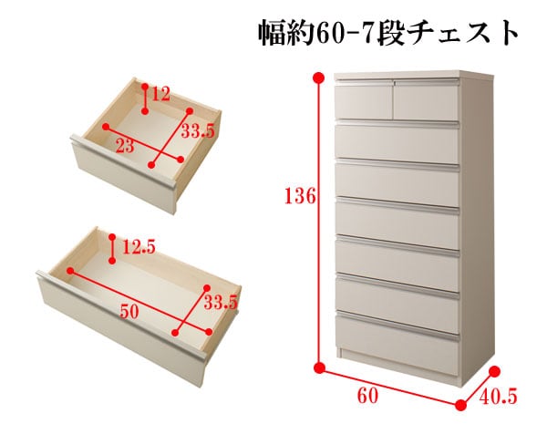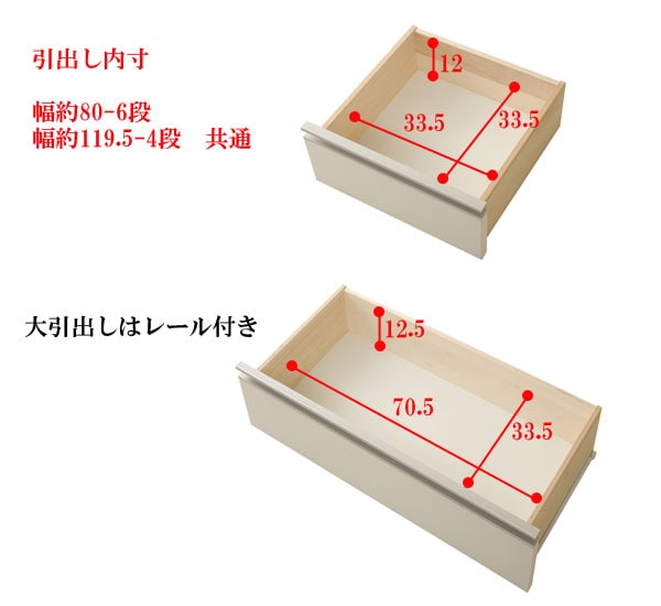| 本体:(約)幅80×奥行40.5×高さ118cm 引出し内寸:小/(約)幅33.5×奥行き33.5×深さ12 大/(約)幅70.5×奥行き33.5×深さ12.5 |