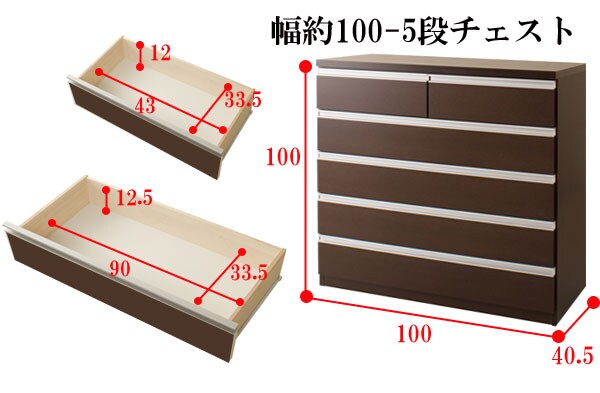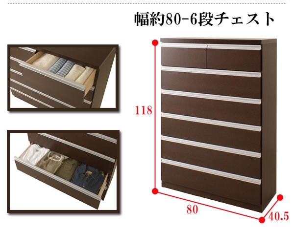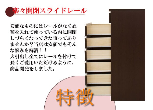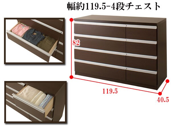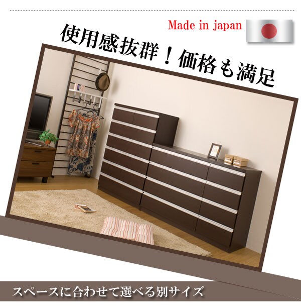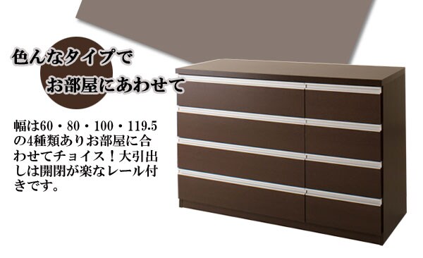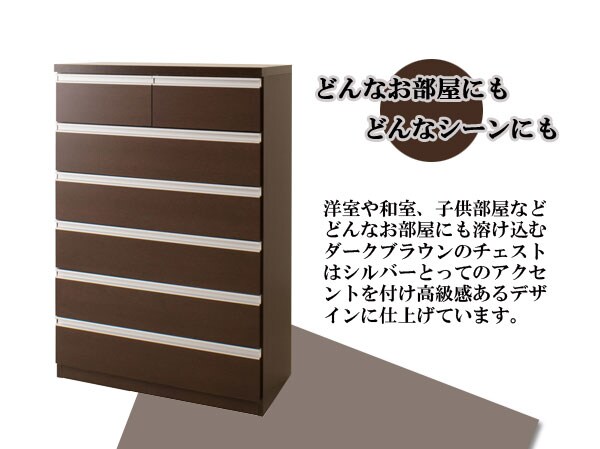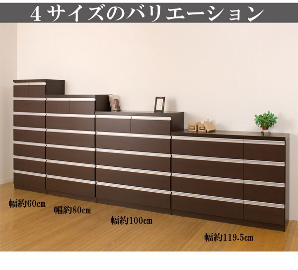 | シャープなデザインが際立つシンプル&高級チェストシルバーの取っ手がアクセントになり高級感を更に醸し出します。サイズは60幅・80幅・100幅・119.5幅の4サイズにホワイトとダークブラウンの2カラー。安心・安全の国産の完成品でクオリティーの高いチェストです。安価なものにはレールがなく衣類を入れて使っている内に開閉しづらくなってきた事ってありませんか?当店は安価でもそんな悩みを解消!!大引出し全てにレールを付けて長くご愛用いただけるように、商品開発をしました。 |