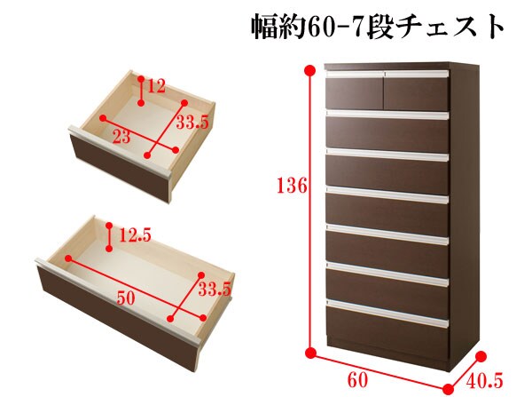 | 本体:(約)幅60×奥行40.5×高さ136cm 引出し内寸:小/(約)幅23×奥行き33.5×深さ12 大/(約)幅50×奥行き33.5×深さ12.5 |