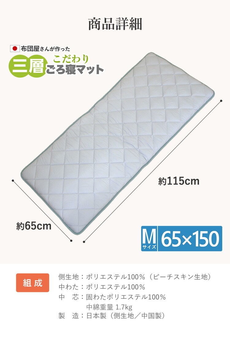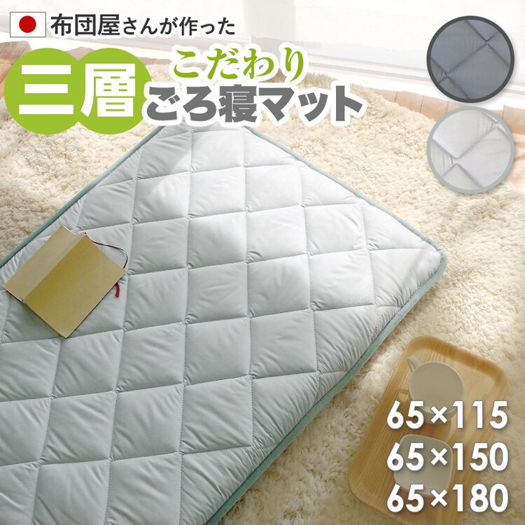 3層ごろ寝マット 日本製 65×150cm 国産 パイピング加工 キルティング加工 ダイヤキルト 固綿 ヘたりにくい 底付き感なし 敷布団 敷き布団 コンパクト 省スペース 折り畳み【送料無料】