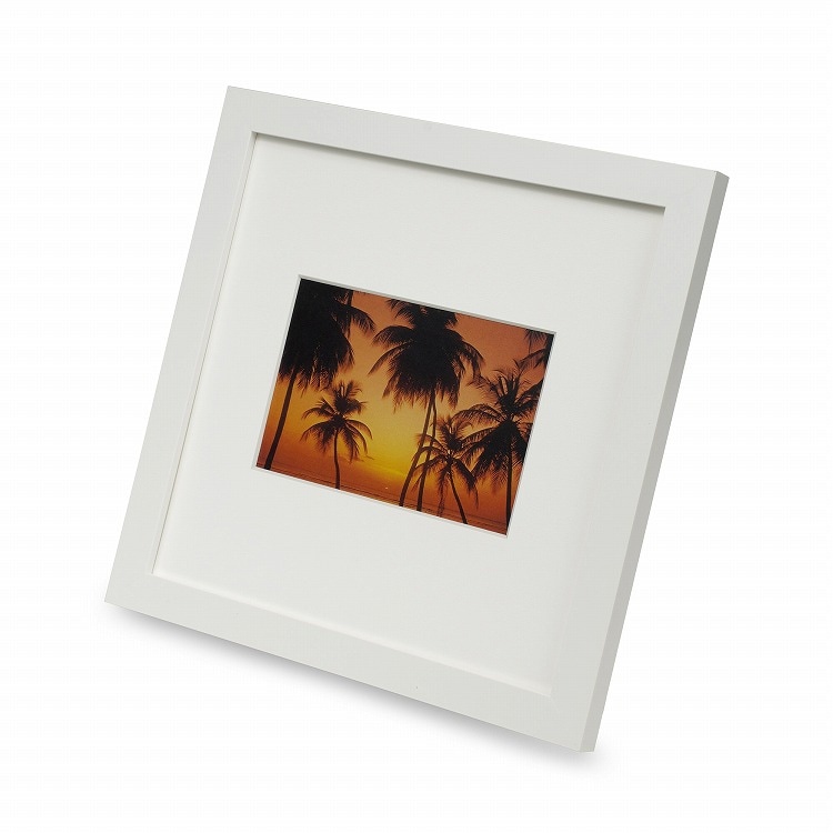 落ち着きのあるフラットなスクエア型フレームと、ワイド幅のVカット台紙が、写真をおしゃれで贅沢な印象に飾り立てます。どんなインテリアにも合わせやすいスタイリッシュでプレーンなデザインは、プレゼントにもおすすめです。