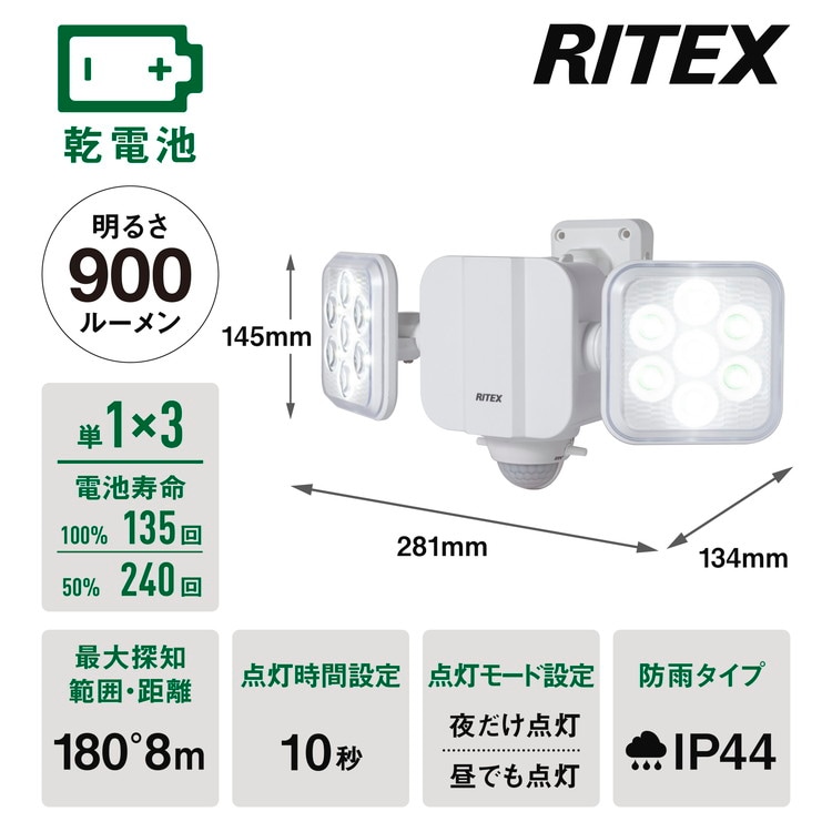 電池寿命=100%点灯時(約4.5か月/135日)、50%点灯時(約8か月/240日)※1日10回点灯(使用環境・電池の性能により異なります。)