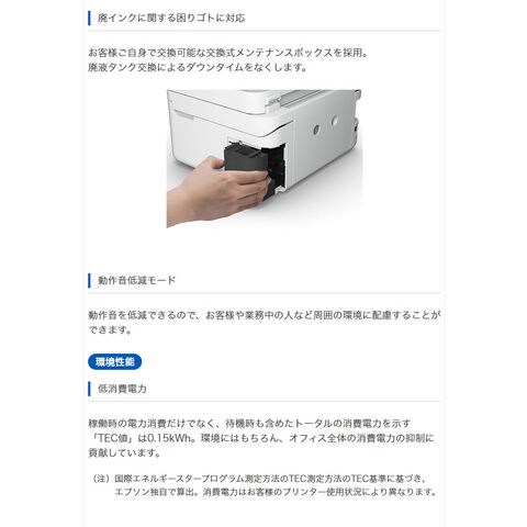 (注6)国際エネルギースタープログラム測定方法のTEC 基準に基づき、エプソン独自で算出(測定条件はこちら)。消費電力量はお客様のプリンター使用状況により異なります。