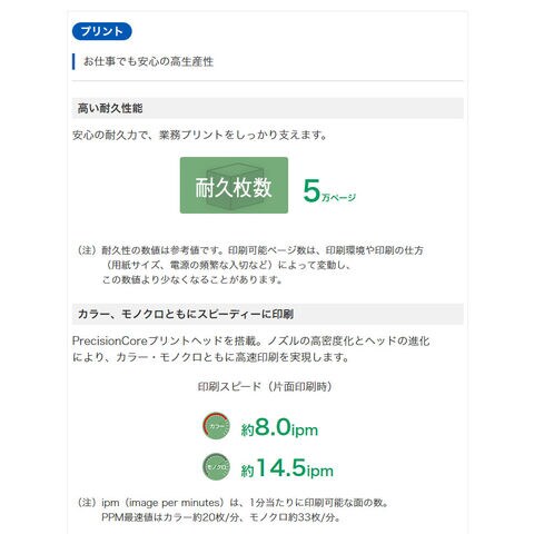 (注5)耐久性の数値は参考値。印刷可能ページ数は、印刷環境や印刷の仕方(用紙サイズ、電源の頻繁な入切など)によって変動し、この数値より少なくなることがあります。