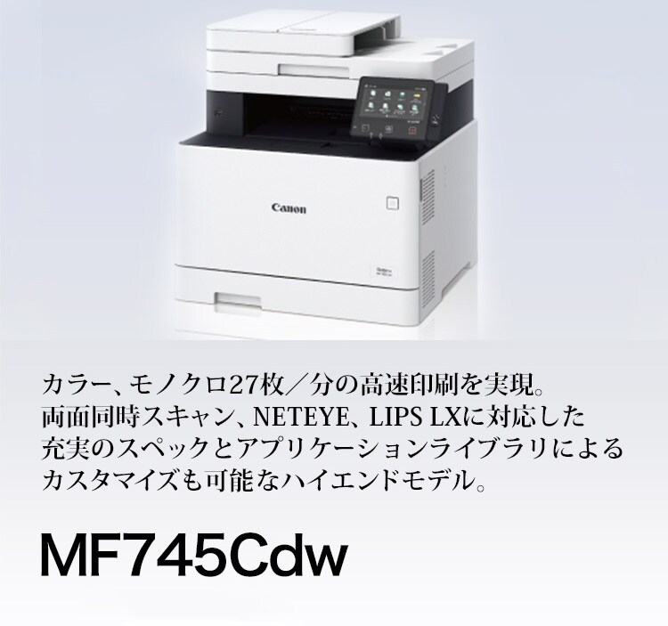 同梱物:MF745Cdw本体、トナーカートリッジ055(C/M/Y)スターター各1本/トナーカートリッジ055(K)、ユーザーソフトウェアDVD-ROM、電源コード(アース線付き)、電話コード、かんたん設置ガイド、かんたん操作ガイド、サポートガイド、保証登録のお願い