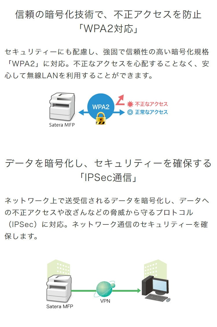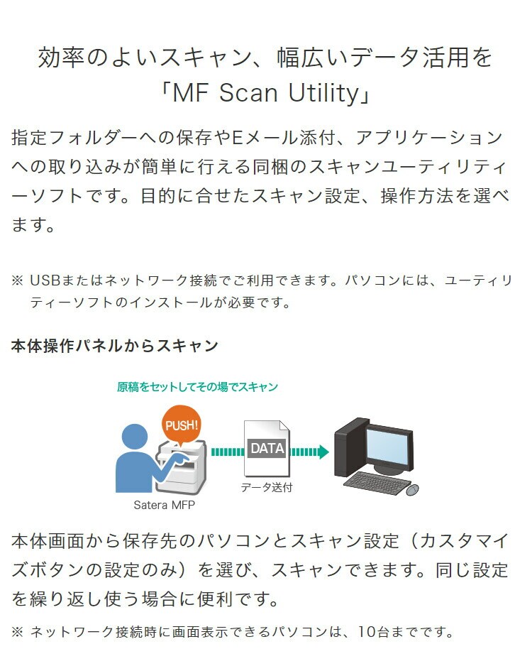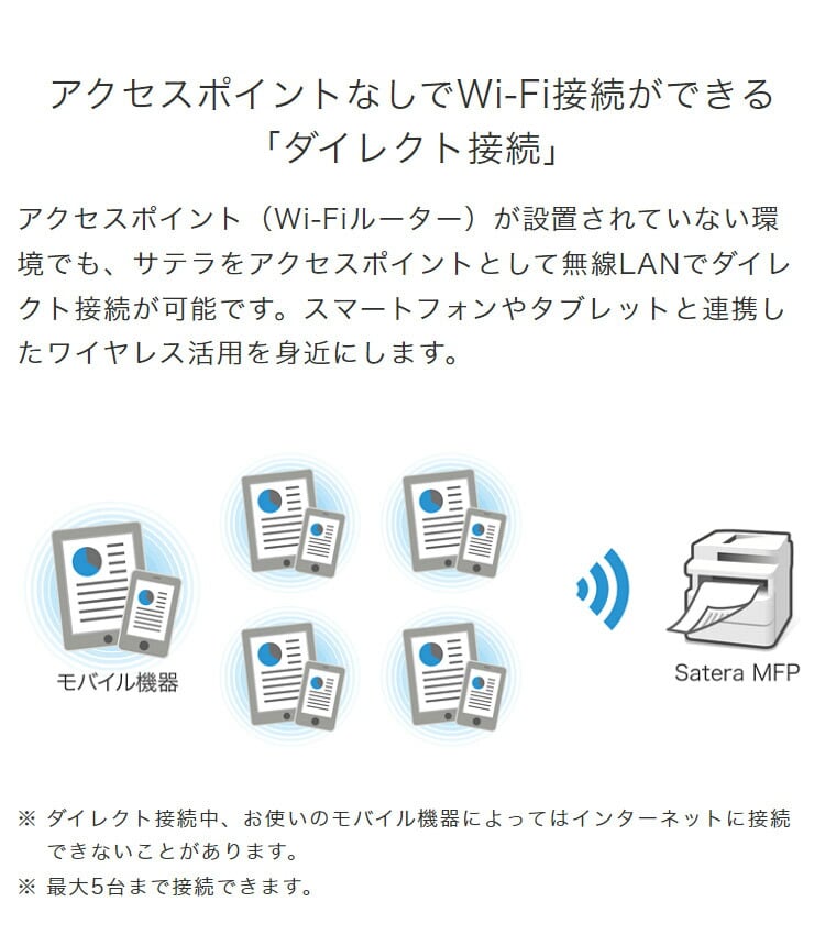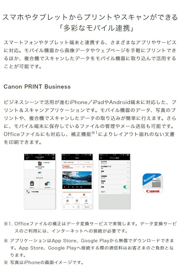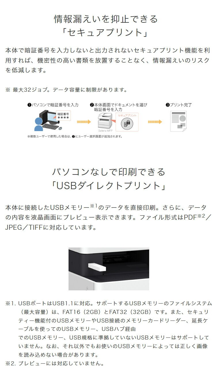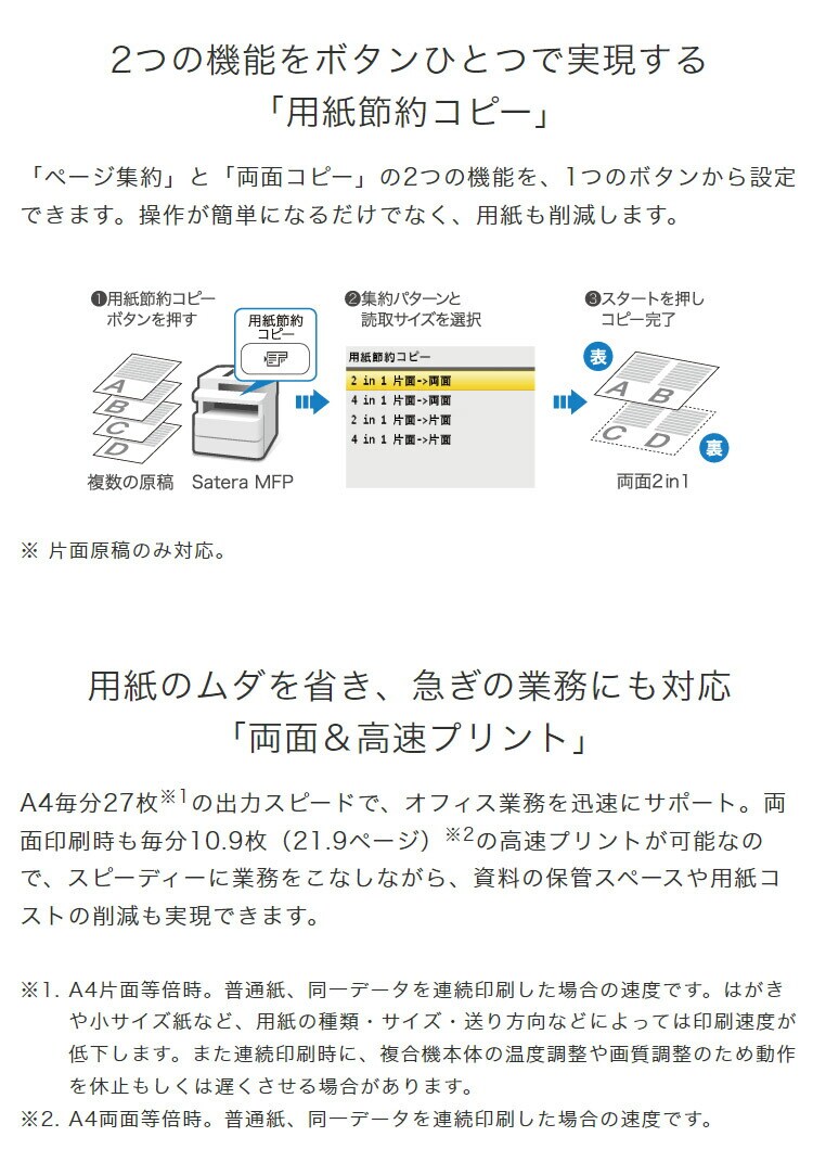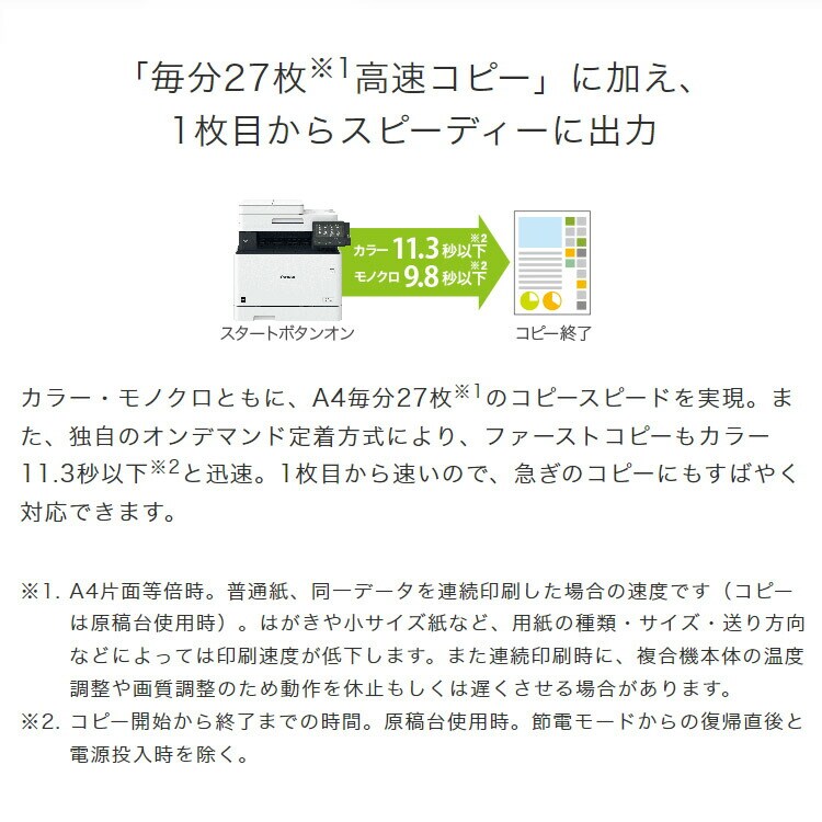 ※7 A4等倍時。普通紙、同一データを連続印刷した場合の速度です(コピーは原稿台使用時)。はがきや小サイズ紙など、用紙の種類・サイズ・送り方向などによっては印刷速度が低下します。また連続印刷時に、複合機本体の温度調整や画質調整のため動作を休止もしくは遅くさせる場合があります。調整直後のプリントは適切に印字されない場合があります。