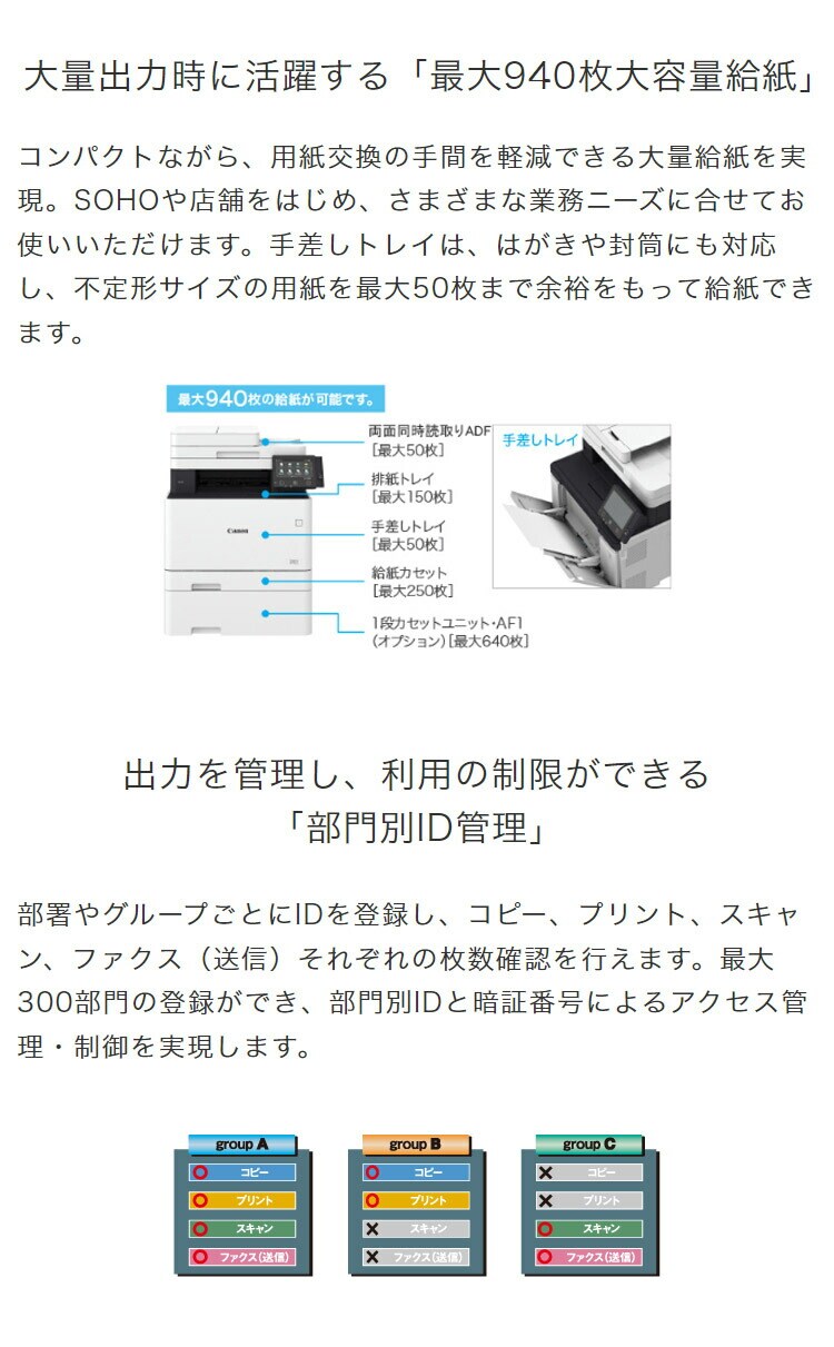 給紙カセット:A4/B5/A5/レター/リーガル/郵便(往復)はがき※1/封筒※2/ユーザー定義サイズ(幅98~216mm、長さ148~355.6mm)