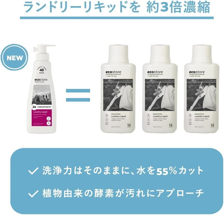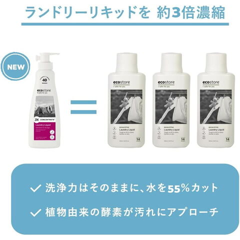 ポンプ式・約3倍濃縮タイプの洗濯洗剤。時短、省スペース、洗濯1回あたりお得 *。植物・ミネラル由来で肌にも環境にも優しく、衣類を清潔に仕上げます。*自社ランドリーリキッド500ml比較