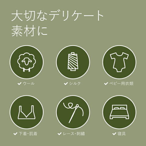 大切に着たいデリケートな素材の衣類をふっくと柔らかく仕上げるおしゃれ着用洗剤。ニットやレース、シルクなどの衣類や、マスク・ぬいぐるみなどの手洗いにも。