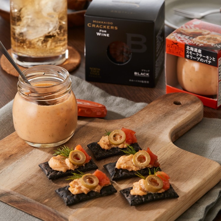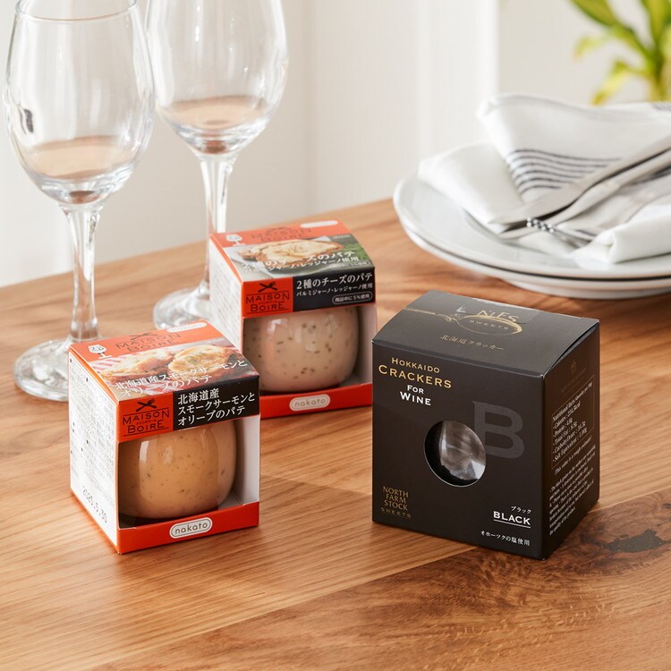 レストランやバルで味わうような本格的なおつまみのシリーズ、メゾンボワールのパテ2種と、載せるだけで映えるノースファームストックのブラッククラッカーを合わせたおつまみセットです。