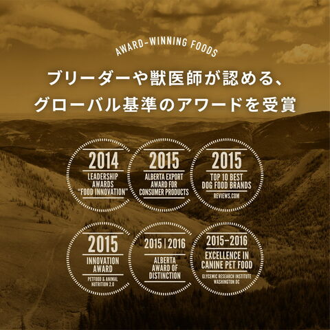 新鮮鶏肉(18%), 新鮮七面鳥肉(7%), 新鮮全卵(5%), 新鮮鶏レバー(5%), 新鮮丸ごとカレイ(4%), 新鮮丸ごとニシン(4%), 新鮮七面鳥レバー(4%), 新鮮鶏心臓(4%), 新鮮七面鳥心臓(4%), 新鮮鶏ネック(4%), ディハイドレート鶏肉(4%), ディハイドレート七面鳥肉(4%), ディハイドレート丸ごとサバ(4%), ディハイドレート丸ごとイワシ(4%), ディハイドレート丸ごとニシン(4%), 鶏脂肪(3%), 丸ごと赤レンズ豆, 丸ごとグリーンピース, 丸ごと緑レンズ豆, 丸ごとヒヨコ豆, 丸ごとイエローピース, レンズ豆繊維, 丸ごとピント豆, 丸ごと白インゲン豆, ディハイドレート鶏軟骨(1%), ニシン油(1%), フリーズドライ鶏レバー, フリーズドライ七面鳥レバー, 新鮮丸ごとカボチャ, 新鮮丸ごとバターナッツスクワッシュ, 新鮮丸ごとズッキーニ, 新鮮丸ごとパースニップ, 新鮮ニンジン, 新鮮丸ごとレッドデリシャスリンゴ, 新鮮丸ごとバートレット梨, 新鮮ケール, 新鮮ホウレン草, 新鮮ビートの葉, 新鮮カブラ菜, ブラウンケルプ, 丸ごとクランベリー, 丸ごとブルーベリー, 丸ごとサスカトゥーンベリー, チコリールート, ターメリック, オオアザミ, ゴボウ, ラベンダー, マシュマロルート, ローズヒップ 添加栄養素(1kg当たり):亜鉛キレート: 100mg, 銅キレート: 11mg, 塩化コリン: 1200mg 添加腸球菌:エンテロコッカスフェシウムNCIMB10415:600x10^6CFU