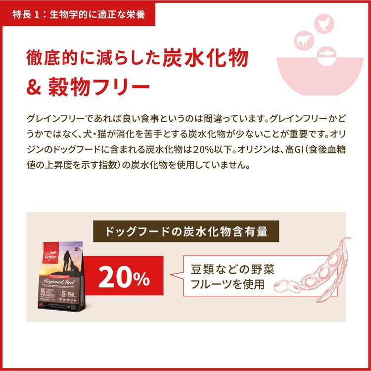 新鮮鶏肉(18%), 新鮮七面鳥肉(7%), 新鮮全卵(5%), 新鮮鶏レバー(5%), 新鮮丸ごとカレイ(4%), 新鮮丸ごとニシン(4%), 新鮮七面鳥レバー(4%), 新鮮鶏心臓(4%), 新鮮七面鳥心臓(4%), 新鮮鶏ネック(4%), ディハイドレート鶏肉(4%), ディハイドレート七面鳥肉(4%), ディハイドレート丸ごとサバ(4%), ディハイドレート丸ごとイワシ(4%), ディハイドレート丸ごとニシン(4%), 鶏脂肪(3%), 丸ごと赤レンズ豆, 丸ごとグリーンピース, 丸ごと緑レンズ豆, 丸ごとヒヨコ豆, 丸ごとイエローピース, レンズ豆繊維, 丸ごとピント豆, 丸ごと白インゲン豆, ディハイドレート鶏軟骨(1%), ニシン油(1%), フリーズドライ鶏レバー, フリーズドライ七面鳥レバー, 新鮮丸ごとカボチャ, 新鮮丸ごとバターナッツスクワッシュ, 新鮮丸ごとズッキーニ, 新鮮丸ごとパースニップ, 新鮮ニンジン, 新鮮丸ごとレッドデリシャスリンゴ, 新鮮丸ごとバートレット梨, 新鮮ケール, 新鮮ホウレン草, 新鮮ビートの葉, 新鮮カブラ菜, ブラウンケルプ, 丸ごとクランベリー, 丸ごとブルーベリー, 丸ごとサスカトゥーンベリー, チコリールート, ターメリック, オオアザミ, ゴボウ, ラベンダー, マシュマロルート, ローズヒップ 添加栄養素(1kg当たり):亜鉛キレート: 100mg, 銅キレート: 11mg, 塩化コリン: 1200mg 添加腸球菌:エンテロコッカスフェシウムNCIMB10415:600x10^6CFU