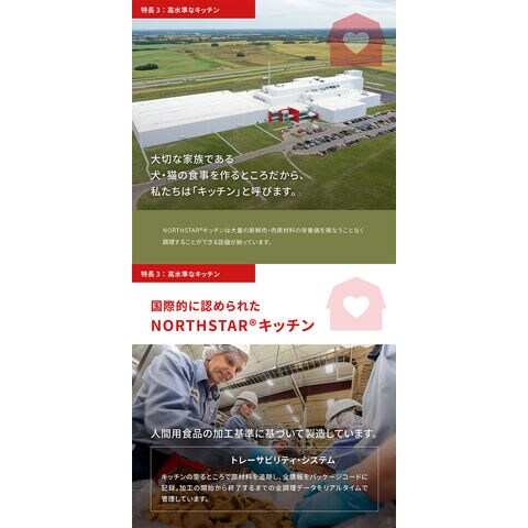 新鮮アンガスビーフ(8%), 新鮮イノシシ肉(4%), 新鮮ヘイゲンバイソン肉(4%), 新鮮または生のロムニー種ラム肉(4%), 新鮮ヨークシャー種豚肉(4%), 新鮮牛レバー(4%), 新鮮イノシシレバー(4%), 新鮮牛トライプ(4%), 新鮮丸ごとイワシ(4%), 新鮮全卵(4%), ディハイドレートラム肉(4%), ディハイドレート牛肉(4%), ディハイドレート丸ごとニシン(3.5%), ディハイドレート丸ごとイワシ(3.5%) ディハイドレートマトン肉(3.5%), 牛脂肪(3.5%), 新鮮牛腎臓(3.5%), 新鮮牛心臓(3.5%), ディハイドレート豚肉(3.5%), 丸ごと赤レンズ豆, 丸ごと緑レンズ豆, 丸ごとグリーンピース, レンズ豆繊維, 丸ごとヒヨコ豆, 丸ごとイエローピース, 丸ごとピント豆, 新鮮豚レバー(1.5%), 新鮮ラムレバー(1.5%), ディハイドレートスケトウダラ(1.5%), ニシン油(1%), ラムトライプ(1%), ディハイドレート牛軟骨(1%), 日干しアルファルファ, フリーズドライ牛レバー, フリーズドライ牛トライプ, フリーズドライラムレバー, フリーズドライラムトライプ, 新鮮丸ごとカボチャ, 新鮮丸ごとバターナッツスクワッシュ, 新鮮丸ごとズッキーニ, 新鮮丸ごとパースニップ, 新鮮ニンジン, 新鮮丸ごとレッドデリシャスリンゴ, 新鮮丸ごとバートレット梨, 新鮮ケール, 新鮮ホウレン草, 新鮮ビートの葉, 新鮮カブラ菜, ブラウンケルプ, 丸ごとクランベリー, 丸ごとブルーベリー, 丸ごとサスカトゥーンベリー, チコリールート, ターメリック, オオアザミ, ゴボウ, ラベンダー, マシュマロルート, ローズヒップ 添加栄養素(1kg当たり):亜鉛キレート: 100mg, 銅キレート: 11mg, 塩化コリン: 1200mg 添加腸球菌:エンテロコッカスフェシウムNCIMB10415:600x10^6CFU