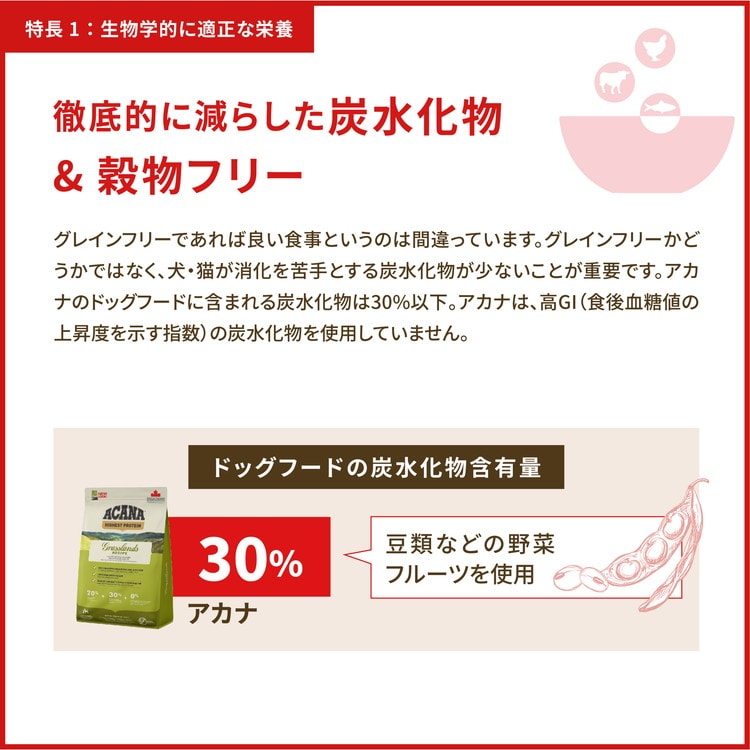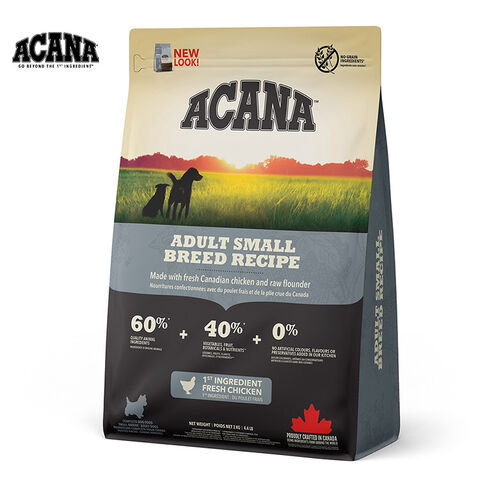 アカナ アダルトスモールブリードは地元の草原農場産の放し飼いコッブ種鶏肉、全卵、バンクーバー島産の天然カレイ、太陽の日差しを浴びて熟したオカナガンバレー産のフルーツと野菜をたっぷり使用しています。豊富なたんぱく質と低炭水化物により、おいしく食べるだけで健康なからだ作りと体重コントロールをサポートしてくれる小型犬のためのバランス栄養食です。従来品と比較して新鮮野菜・フルーツ原材料の種類・配合比率が向上しました。穀類、タピオカ、ジャガイモを一切使用せず、生物学的に適正なフードとして更なるグレードアップを実現しました。