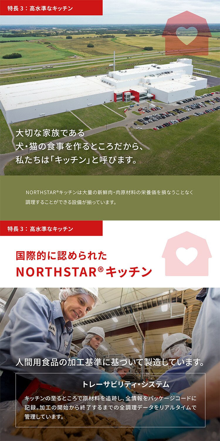 新鮮鶏肉 (14%), 乾燥鶏肉 (14%), 丸ごと赤レンズ豆, 丸ごとグリーンピース, 丸ごとヒヨコ豆, 新鮮鶏内臓 (レバー, 心臓) (5.5%), 乾燥ニシン (5%), 鶏脂肪 (5%), 乾燥七面鳥肉 (5%), 卵 (4%), 生カレイ (4%), フィッシュオイル (3%), 丸ごと緑レンズ豆, 丸ごとイエローピース, エンドウ豆繊維, エンドウ豆スターチ, 生七面鳥レバー (0.5%), 塩, 乾燥ケルプ, 新鮮丸ごとリンゴ, 新鮮丸ごとバターナッツスクワッシュ, 新鮮丸ごとニンジン, 新鮮丸ごと洋梨, 新鮮丸ごとカボチャ, 新鮮丸ごとズッキーニ, 新鮮ビートの葉, 新鮮ケール, 新鮮ホウレン草, 新鮮カブラ菜, 新鮮丸ごとブルーベリー, 新鮮丸ごとクランベリー, 新鮮丸ごとサスカトゥーンベリー, ゴボウ, ラベンダー, マシュマロルート, オオアザミ, ローズヒップ, ターメリック 植物油から抽出したトコフェロール: 121mg, クエン酸: 40mg, ローズマリーエキス: 80mg 添加栄養素(1kgあたり): 3a890 塩化コリン(コリン): 700 mg, 3b606 (亜鉛: 75 mg), 3b406 (銅: 11mg), 3a821ビタミンB1: 25mg, 3a841ビタミンB5: 8mg, 3b831ビタミンB6: 7.5mg, 3a672aビタミンA: 1875 IU, 3a671ビタミンD3: 250 IU, 3a700 ビタミンE: 115 IU 添加腸球菌: 4b1707 エンテロコッカスフェシウム菌 NCIMB 10415 2.2x10^6 CFU.