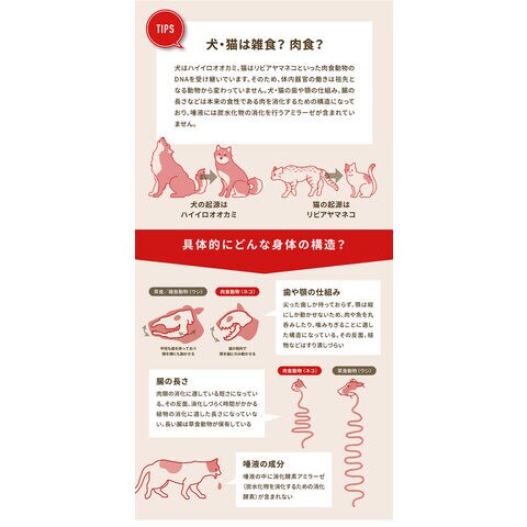 生の丸ごと太平洋ニシン (14%)、生の丸ごと太平洋サバ(13%)、生の丸ごとヘイク(9%)、ディハイドレートニシン(8%)、ディハイドレートアオギス(8%)、ディハイドレートサバ(8%)、丸ごとピント豆、丸ごとエンドウ豆、生の天然カレイ(5%)、ポロック油(5%)、丸ごと赤レンズ豆、丸ごとヒヨコ豆、丸ごと緑レンズ豆、生の丸ごとメバル(4%)、ヒマワリ油、レンズ豆繊維、フリーズドライタラレバー(1%)、乾燥ケルプ、新鮮丸ごとカボチャ、新鮮丸ごとバターナッツスクワッシュ、新鮮ケ―ル、新鮮ホウレン草、新鮮カブラ菜、新鮮ニンジン、新鮮リンゴ、新鮮洋梨、新鮮丸ごとクランベリー、新鮮丸ごとブルーベリー、チコリールート、ターメリックルート、オオアザミ、ゴボウ、ラベンダー、マシュマロルート、ローズヒップ
