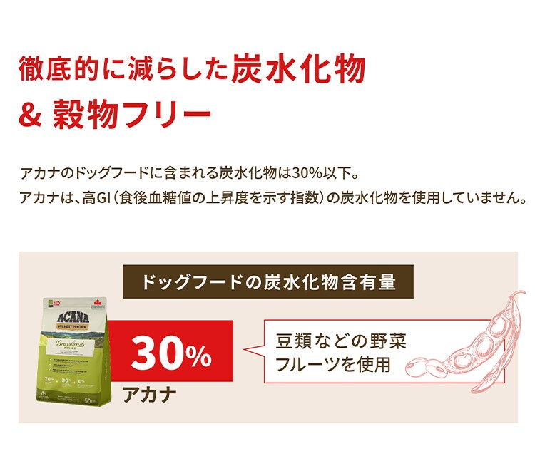 ・広大で豊かな草原や北部の湖からインスピレーションを得たアカナグラスランドは、放し飼いの鴨肉、巣に産み落とされた全卵、白身魚、放し飼いの七面鳥肉等をふんだんに使用しています。 ・猫本来の食事を再現したWholePrey比率に合わせて新鮮肉または生肉の状態で毎日搬送される地域の新鮮な原材料が使用されたアカナグラスランドは、食事から愛猫に自然で必要な栄養を与えることができます。