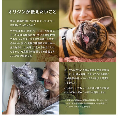 「オリジン ガーディアン8」は、猫によく見られる8つの健康にまつわる悩みに対応するために特別に作られた、栄養価の高いキャットフードです。フードには新鮮または生の丸ごとの動物性原材料を全体の90%使用し、添加栄養素を最低限に抑えました。フードに使用する原材料の3分の2は新鮮、または生のものにこだわっています。愛猫の健康維持に「オリジン ガーディアン8」が大きく役立つことでしょう。