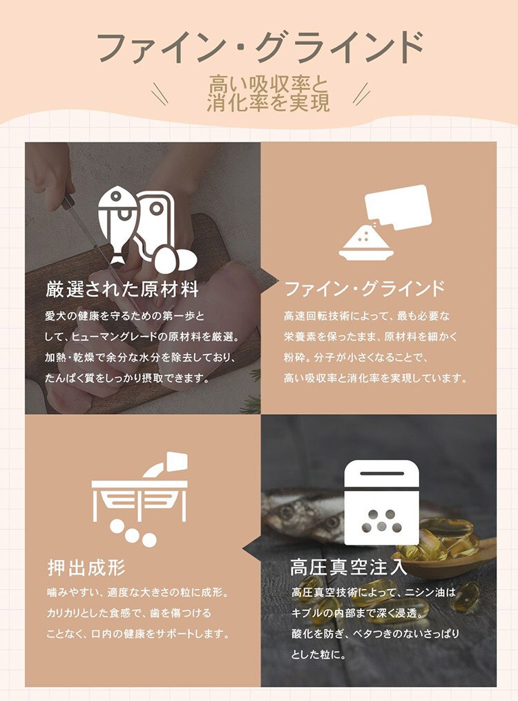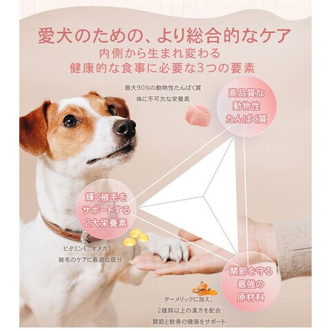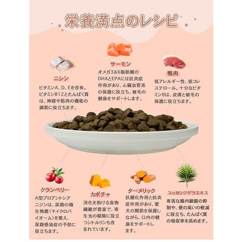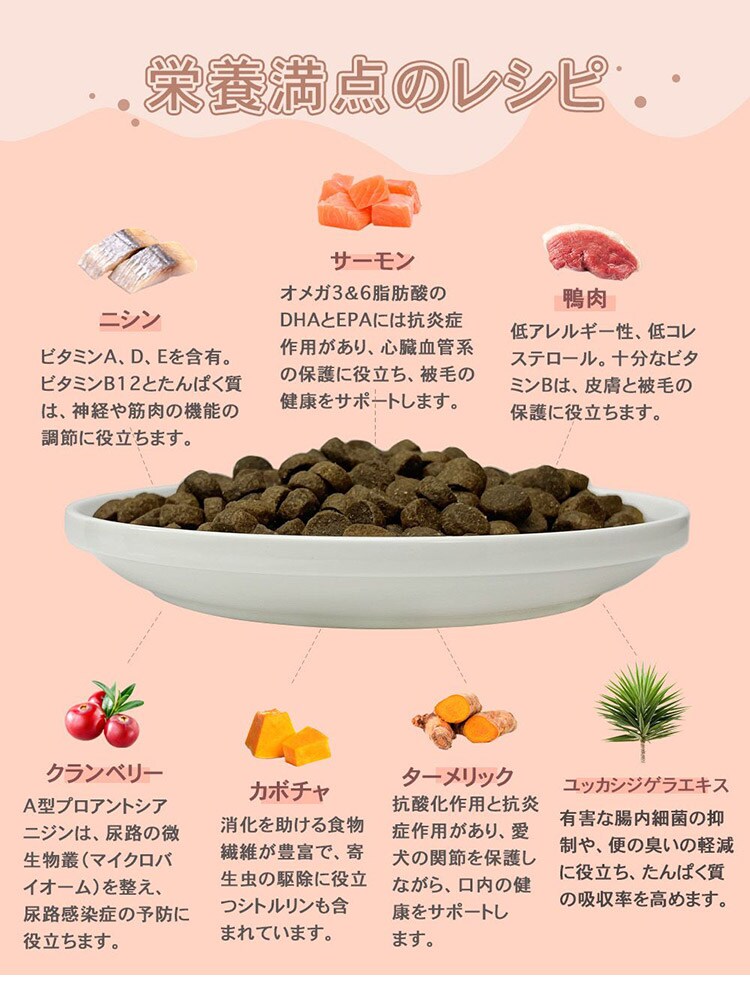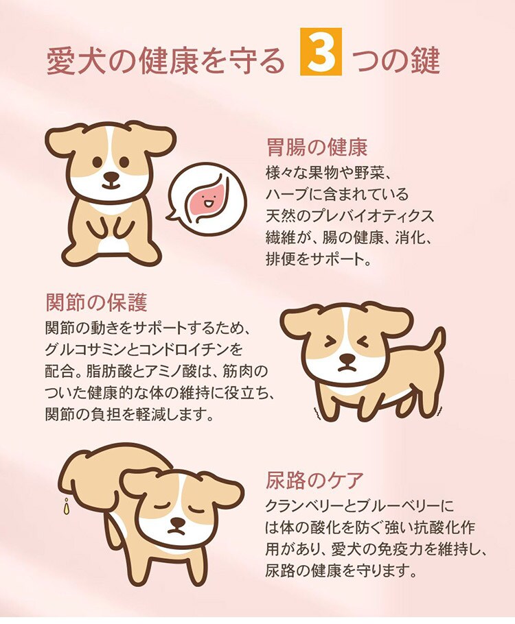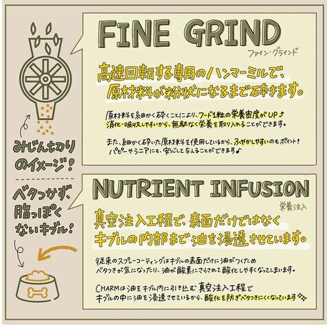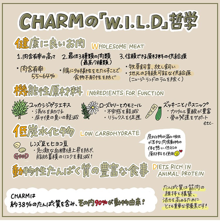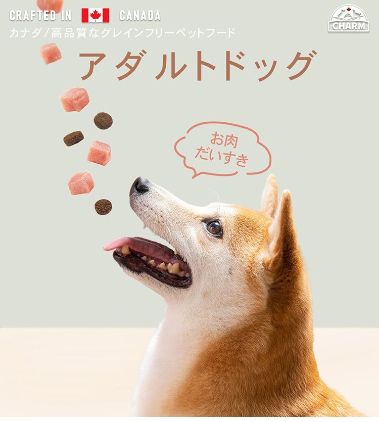 チャーム アダルトドッグは、成犬が最高の健康状態を維持できるよう特別に配合されています。Non-GMO(非遺伝子組み換え)原材料を使用し、トウモロコシや小麦、大豆を含まない100%グレインフリーで、人工着色料や香料は使用していません。動物性たんぱく質を90%配合し、7種類の異なる動物性たんぱく質を使用しています。このたんぱく質豊富な食事は、内臓の健康や引き締まった筋肉に役立ちます。野菜や果物由来の繊維やプレバイオティクスをブレンドすることで、最適な消化を促します。関節の健康や滑らかな動きをサポートするため、グルコサミンやコンドロイチンを加えています。愛犬が喜ぶ風味となっているだけではなく、愛犬の体の状態も最大限に引き上げます。