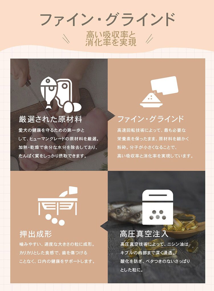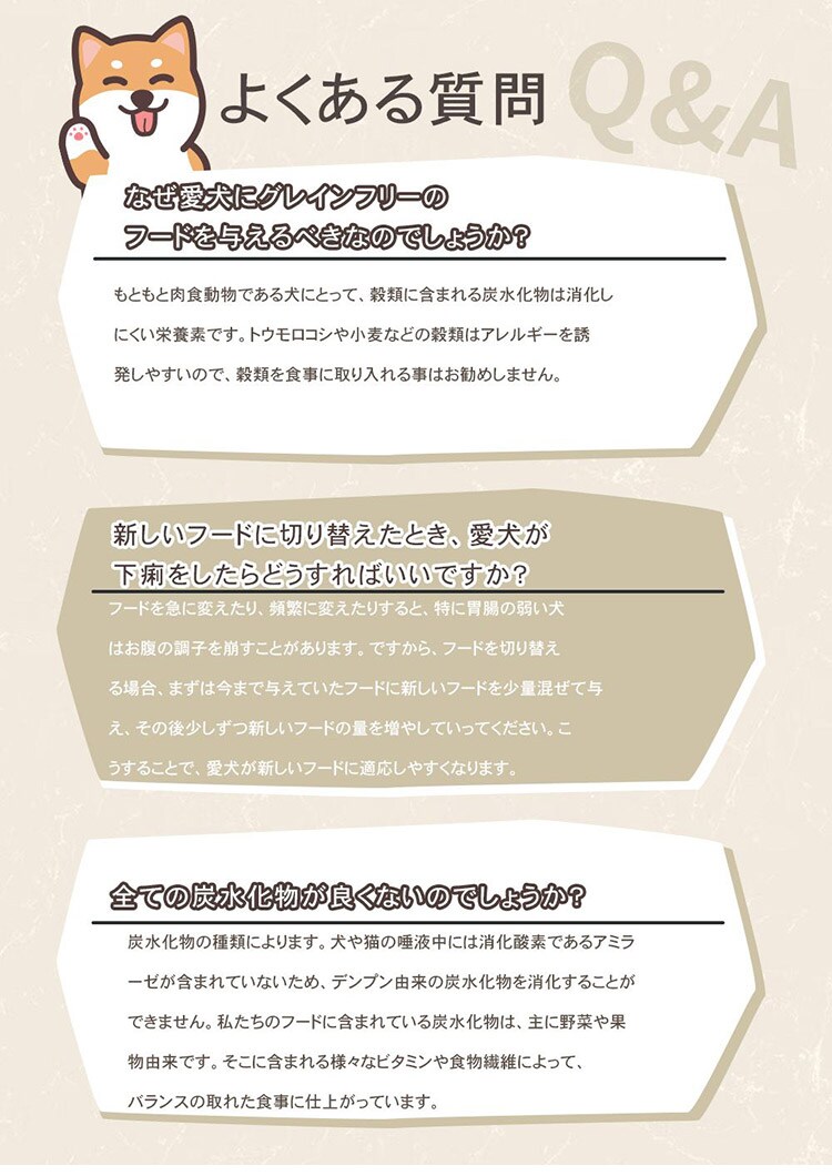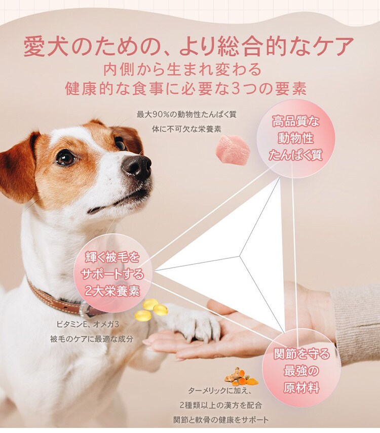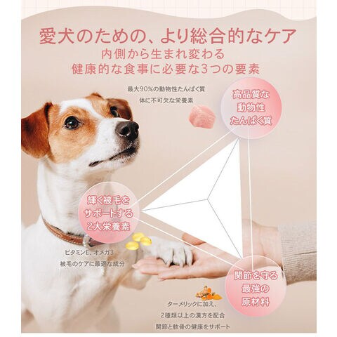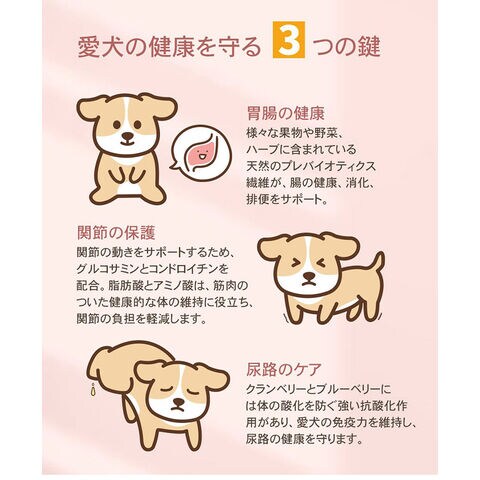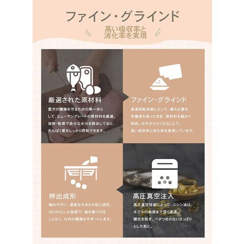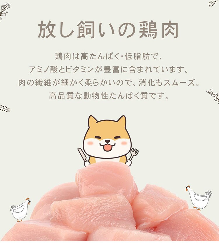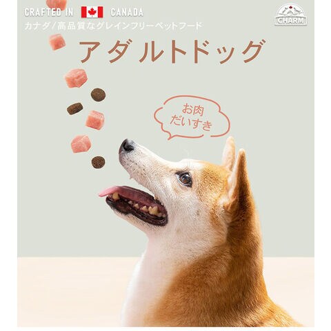 チャーム アダルトドッグは、成犬が最高の健康状態を維持できるよう特別に配合されています。Non-GMO(非遺伝子組み換え)原材料を使用し、トウモロコシや小麦、大豆を含まない100%グレインフリーで、人工着色料や香料は使用していません。動物性たんぱく質を90%配合し、7種類の異なる動物性たんぱく質を使用しています。このたんぱく質豊富な食事は、内臓の健康や引き締まった筋肉に役立ちます。野菜や果物由来の繊維やプレバイオティクスをブレンドすることで、最適な消化を促します。関節の健康や滑らかな動きをサポートするため、グルコサミンやコンドロイチンを加えています。愛犬が喜ぶ風味となっているだけではなく、愛犬の体の状態も最大限に引き上げます。