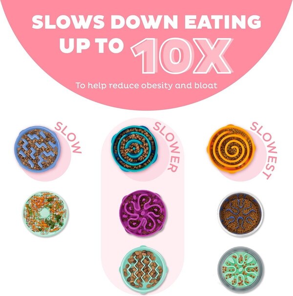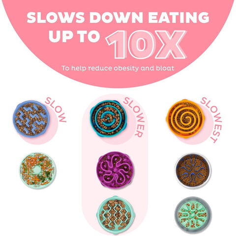 迷路のような突起が食べるスピードをスローダウン。ゆっくり食べることでフードの吐き戻しや肥満のリスクの低下にも。底面には滑り止め付き。