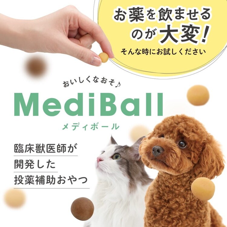 メディボールはお薬が苦手なワンちゃんのために臨床獣医師が開発した投薬補助用のおやつです。鶏ササミがベースなので大変美味しく食べられます。とてもやわらかい質感で、簡単にお薬を包み込むことができるので安心して与えていただけます。