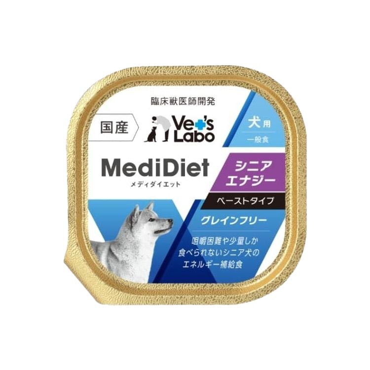 シニア後期(15歳~)は咀嚼力や嚥下力の衰えだけでなく、味覚や嗅覚も落ちて食欲が低下しやすい時期です。また各種疾患を有することも多く、食べても痩せてくることがありますので、少量でカロリーを得られるフードが必要になります。メディダイエット- シニアエナジーは、シリンジで経口的に食べさせやすいペーストタイプのフードです。
