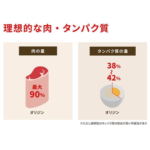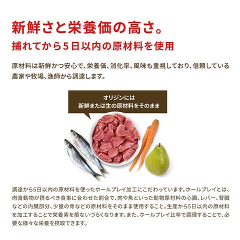 新鮮アンガスビーフ(11%), 新鮮イノシシ肉(4%), 新鮮ヘイゲンバイソン肉(4%), 新鮮または生のロムニー種ラム肉(4%), 新鮮ヨークシャー種豚肉(4%), 新鮮牛レバー(4%), 新鮮牛トライプ(4%), 新鮮丸ごとイワシ(4%), 新鮮全卵(4%), 新鮮イノシシレバー(4%), ディハイドレートラム肉(4%), ディハイドレート牛肉(4%), ディハイドレート丸ごとニシン(4%), ディハイドレートマトン肉(4%), ディハイドレート豚肉(4%), 新鮮ラムレバー(3.5%), 新鮮ラムトライプ(3.5%), ディハイドレート丸ごとイワシ(3%), 新鮮豚レバー(3%), 丸ごと赤レンズ豆, 丸ごと緑レンズ豆, 丸ごとグリーンピース, レンズ豆繊維, 丸ごとヒヨコ豆, 丸ごとイエローピース, 丸ごとピント豆, 牛脂肪(1%), 豚脂肪(1%), ニシン油(1%), ディハイドレート牛軟骨(1%), フリーズドライ牛レバー, フリーズドライ牛トライプ, フリーズドライラムレバー, フリーズドライラムトライプ, 新鮮丸ごとカボチャ, 新鮮丸ごとバターナッツスクワッシュ, 新鮮丸ごとズッキーニ, 新鮮丸ごとパースニップ, 新鮮ニンジン, 新鮮丸ごとレッドデリシャスリンゴ, 新鮮丸ごとバートレット梨, 新鮮ケール, 新鮮ホウレン草, 新鮮ビートの葉, 新鮮カブラ菜, ブラウンケルプ, 丸ごとクランベリー, 丸ごとブルーベリー, 丸ごとサスカトゥーンベリー, チコリールート, ターメリック, オオアザミ, ゴボウ, ラベンダー, マシュマロルート, ローズヒップ 添加栄養素(1kg当たり):亜鉛キレート: 100mg 添加腸球菌:エンテロコッカスフェシウムNCIMB10415:600x10^6CFU