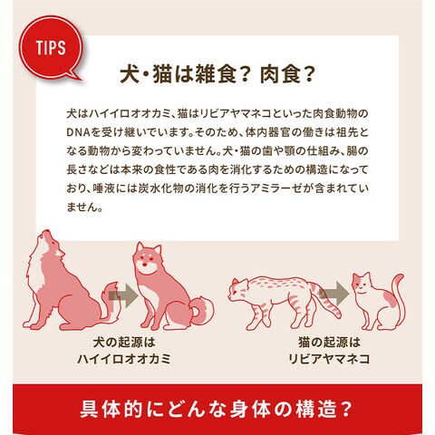 新鮮鶏肉 (18%), 乾燥鶏肉 (18%), 丸ごと赤レンズ豆, 丸ごとグリーンピース, 新鮮鶏内臓 (レバー, 心臓) (7%), 鶏脂肪 (7%), 乾燥七面鳥肉 (4%), 卵(4%), 生カレイ (4%), 乾燥ニシン (4%), フィッシュオイル (3%), 丸ごと緑レンズ豆, 丸ごとヒヨコ豆, 丸ごとイエローピース, エンドウ豆繊維, エンドウ豆スターチ, 生七面鳥レバー (1%), 塩, 乾燥ケルプ, 新鮮丸ごとカボチャ, 新鮮丸ごとバターナッツスクワッシュ, 新鮮丸ごとニンジン, 新鮮丸ごとリンゴ, 新鮮丸ごと洋梨, 新鮮丸ごとズッキーニ, 乾燥チコリールート, 新鮮ケール, 新鮮ホウレン草, 新鮮カブラ菜, 新鮮ビートの葉, 新鮮丸ごとクランベリー, 新鮮丸ごとブルーベリー, 新鮮丸ごとサスカトゥーンベリー, ターメリック, オオアザミ, ゴボウ, ラベンダー, マシュマロルート, ローズヒップ 植物油から抽出したトコフェロール: 121mg, クエン酸: 40mg, ローズマリーエキス: 80mg 添加栄養素(1kgあたり): 3a890 塩化コリン (コリン): 700 mg, 3b606 (亜鉛: 112.5 mg), 3b406 (銅: 11mg), 3a821ビタミンB1: 25mg, 3a841ビタミンB5: 8 mg, 3a831 ビタミンB6: 7.5mg, 3a672aビタミンA: 7500 IU, 3a671ビタミンD3: 1000 IU, 3a700ビタミンE: 100 IU 添加腸球菌: 4b1707 エンテロコッカスフェシウム菌NCIMB 10415 2.2x10^6 CFU.