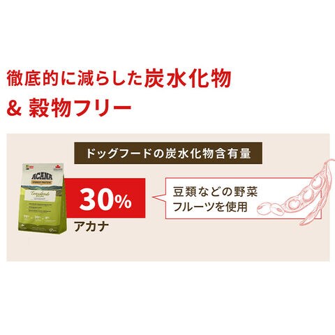 新鮮鶏肉 (18%), 乾燥鶏肉 (18%), 丸ごと赤レンズ豆, 丸ごとグリーンピース, 新鮮鶏内臓 (レバー, 心臓) (7%), 鶏脂肪 (7%), 乾燥七面鳥肉 (4%), 卵(4%), 生カレイ (4%), 乾燥ニシン (4%), フィッシュオイル (3%), 丸ごと緑レンズ豆, 丸ごとヒヨコ豆, 丸ごとイエローピース, エンドウ豆繊維, エンドウ豆スターチ, 生七面鳥レバー (1%), 塩, 乾燥ケルプ, 新鮮丸ごとカボチャ, 新鮮丸ごとバターナッツスクワッシュ, 新鮮丸ごとニンジン, 新鮮丸ごとリンゴ, 新鮮丸ごと洋梨, 新鮮丸ごとズッキーニ, 乾燥チコリールート, 新鮮ケール, 新鮮ホウレン草, 新鮮カブラ菜, 新鮮ビートの葉, 新鮮丸ごとクランベリー, 新鮮丸ごとブルーベリー, 新鮮丸ごとサスカトゥーンベリー, ターメリック, オオアザミ, ゴボウ, ラベンダー, マシュマロルート, ローズヒップ 植物油から抽出したトコフェロール: 121mg, クエン酸: 40mg, ローズマリーエキス: 80mg 添加栄養素(1kgあたり): 3a890 塩化コリン (コリン): 700 mg, 3b606 (亜鉛: 112.5 mg), 3b406 (銅: 11mg), 3a821ビタミンB1: 25mg, 3a841ビタミンB5: 8 mg, 3a831 ビタミンB6: 7.5mg, 3a672aビタミンA: 7500 IU, 3a671ビタミンD3: 1000 IU, 3a700ビタミンE: 100 IU 添加腸球菌: 4b1707 エンテロコッカスフェシウム菌NCIMB 10415 2.2x10^6 CFU.