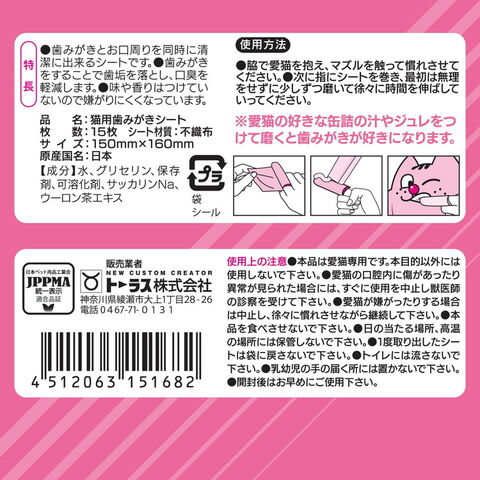 猫ちゃんたちが食べているパウチの汁やジュレなどをシートにつけてることで歯みがきをさせてくれるようになります。味付けをしていないため、お口やあご周りも拭くことができ、汚れを落とすことでニキビなどにも配慮しています