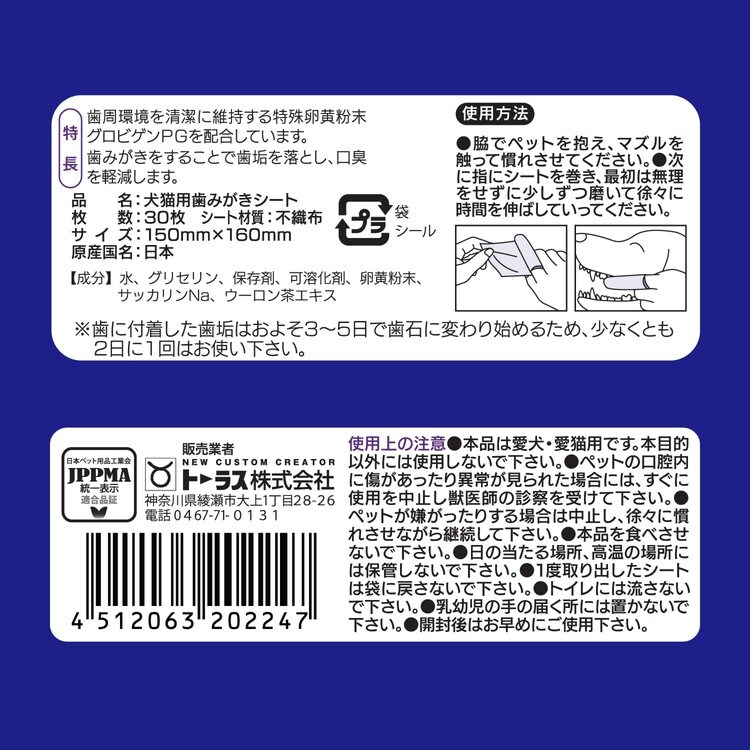 卵黄粉末(グロビゲンPG)を配合した業界初の歯みがきシート。歯垢除去と歯周ケアが同時に出来ることで健康寿命の延伸に貢献します。