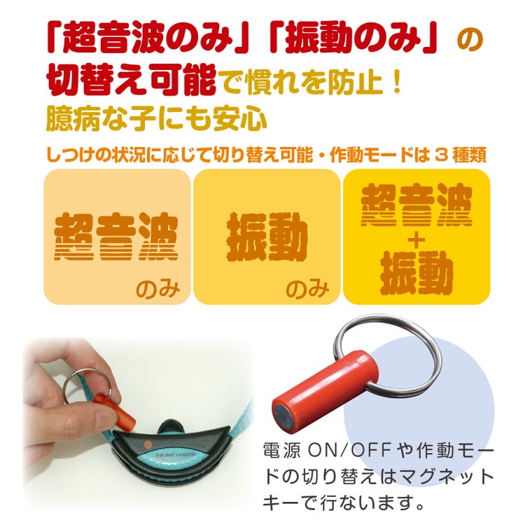 「ピー」「ブルブル」のWパワーで無駄吠えを防止。ブルソニックは愛犬がむだ吠えをした時に震える喉の振動を感知し、振動や超音波を発します。愛犬は吠えた途端に発生する喉に感じる振動や、聞きなれない超音波に驚き、無駄吠えを控えるようになります。振動と超音波を3つのパターンで組み合わせることにより作動に対する慣れを防止。愛犬に着けていることを感じさせない程の超軽量設計を実現しています。