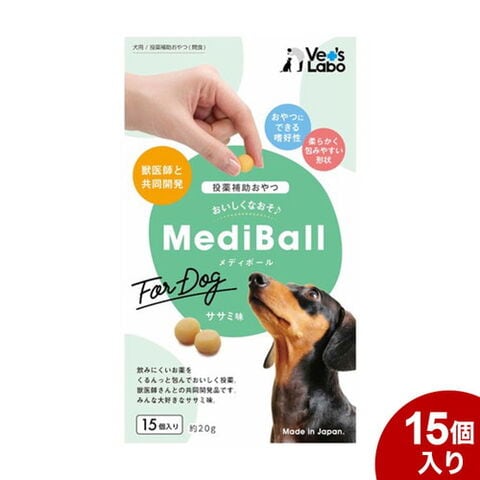 メディボールはお薬が苦手なワンちゃんのために獣医師と共同で開発した投薬補助用のおやつです。鶏ササミがベースなので大変美味しく食べられます。とてもやわらかい質感で、簡単にお薬を包み込むことができるので安心して与えていただけます。